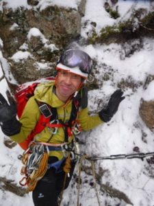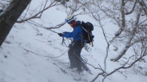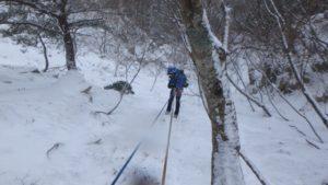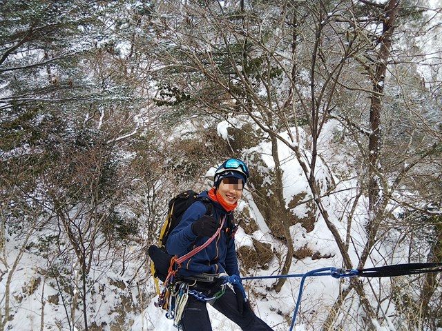 60mシングルロープ2本担いで懸垂下降中のH籐CL。