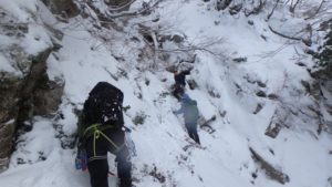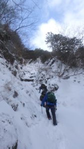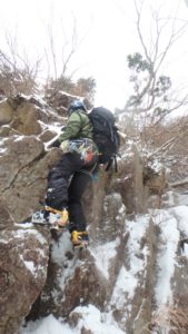 30分ほどで第一ルンゼ出合の堰堤に到着し、アイゼンとギア類を装着して、第一ルンゼを登り始める。