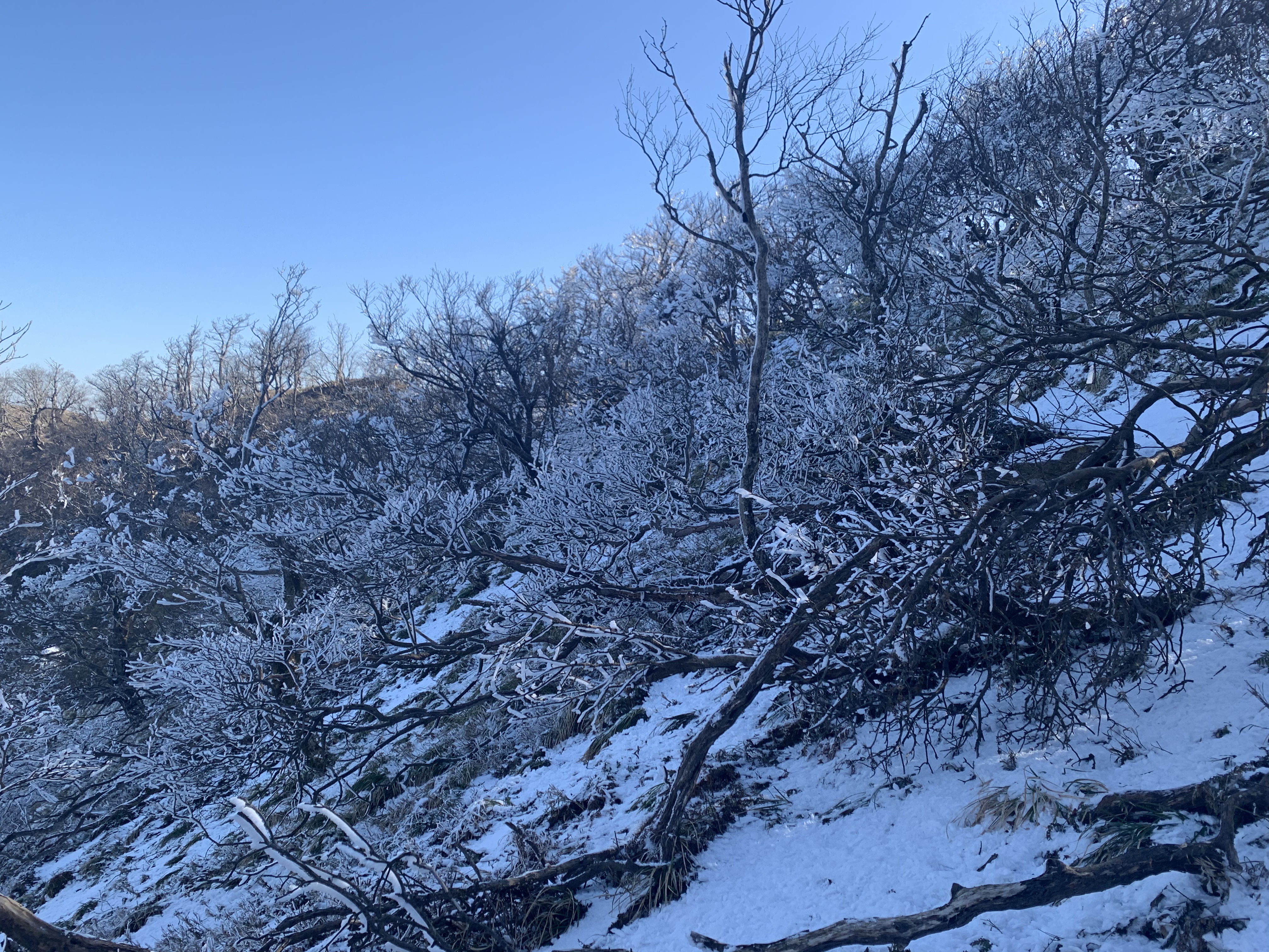 冬山入門として、初冬山を登らせていただきました。この一週間、頂上は凍えるくらい寒いのでは、、ちゃんと雪の上を歩けるかなぁ、、不安でした。当日は、お天気にも恵まれ、とても暖かく、雪が少なそうでしたが同時に少しホッとしました。念願の霧氷を見れるかなぁとワクワクした気持ちを持ちながら登り始めました。