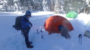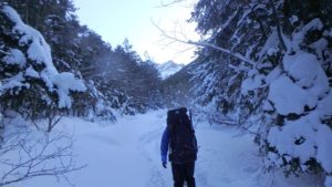 雪は例年よりだいぶ少ないらしく、結局、テント場の行者小屋まではアイゼンを付けることもなく到着。