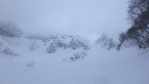 あっという間に終了かと思ったその時! 急にガスが抜けて現れた別山尾根中央稜バットレス様。あれが幻のカンテか??