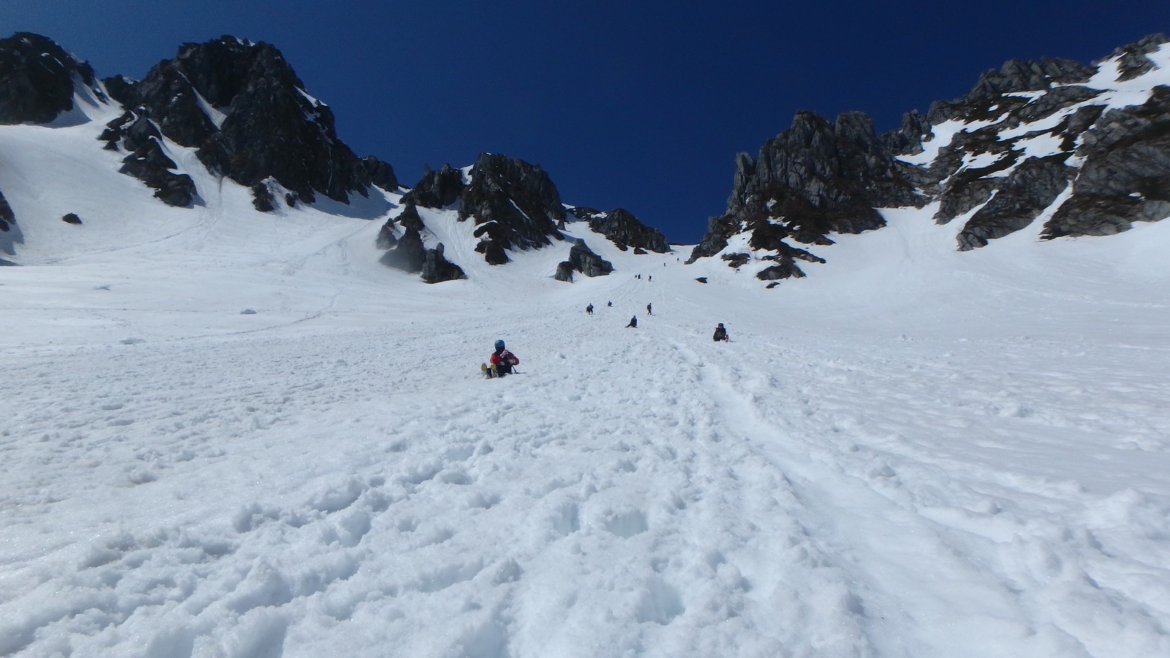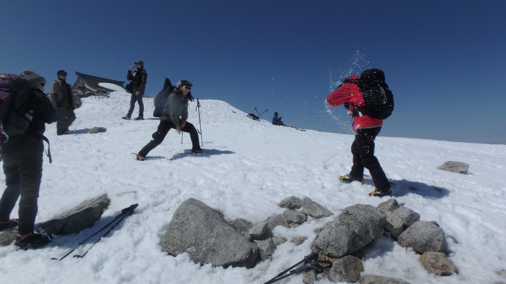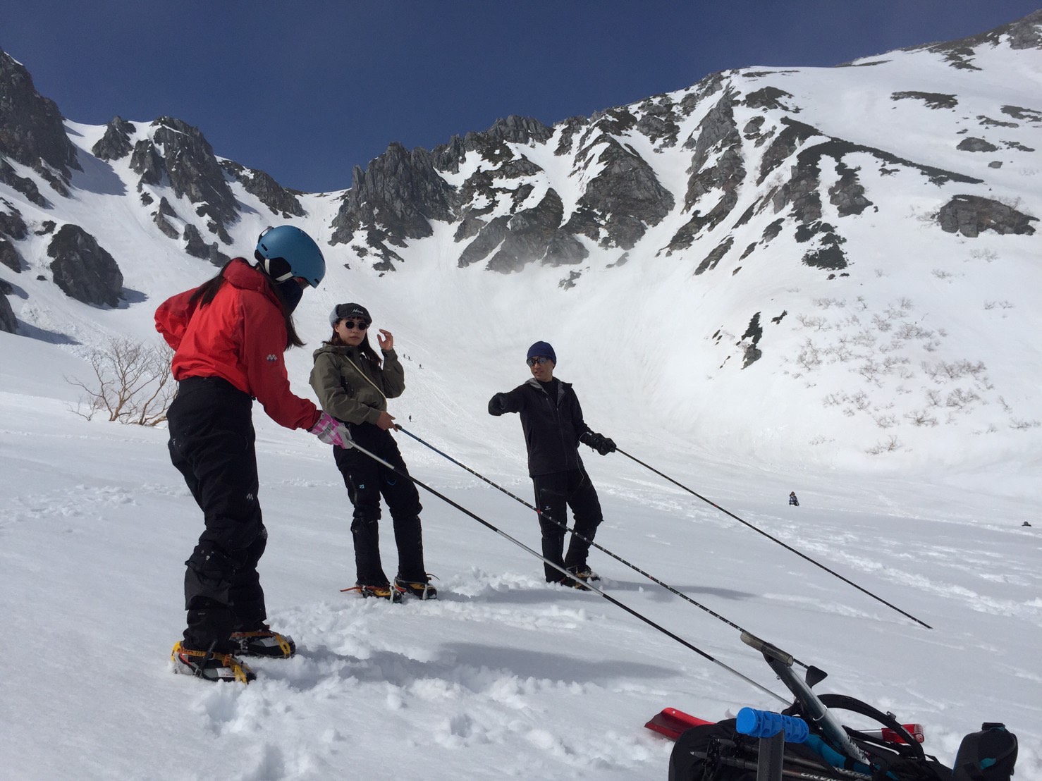 on the way to go back to the Rope way station at end of the Hacho slope, we tried some hip slide to practice for the pickel.