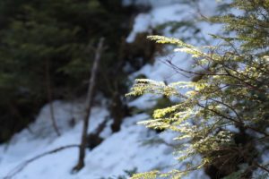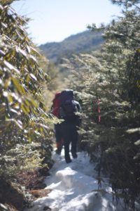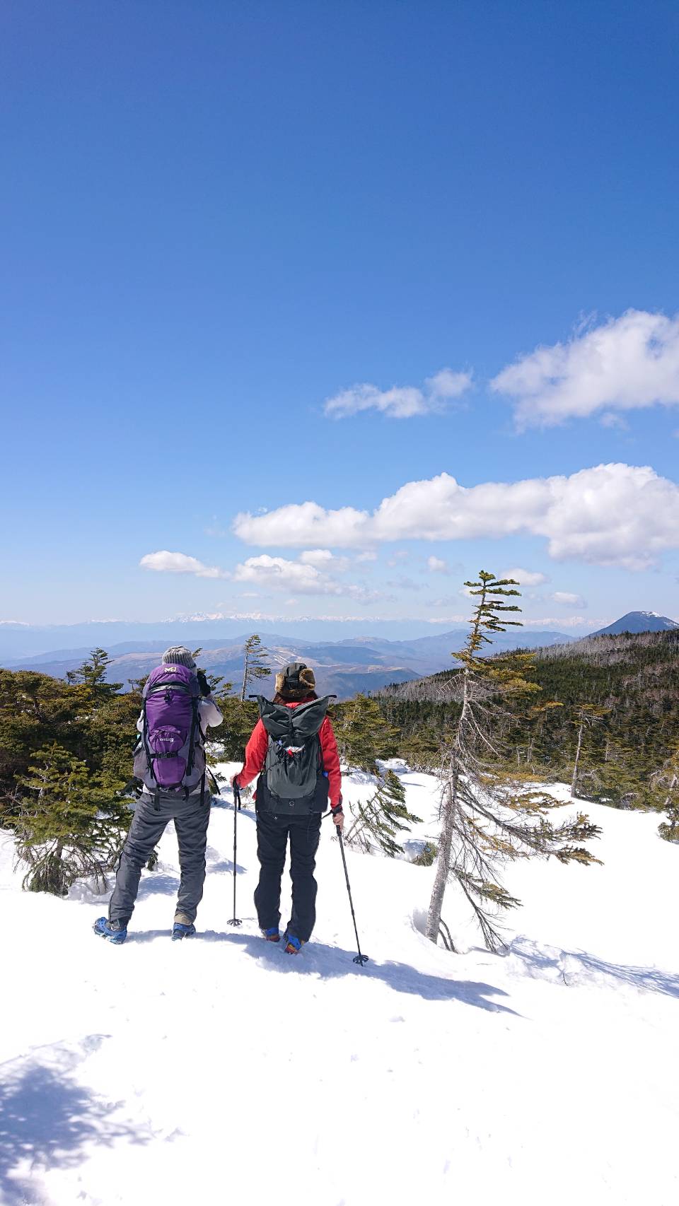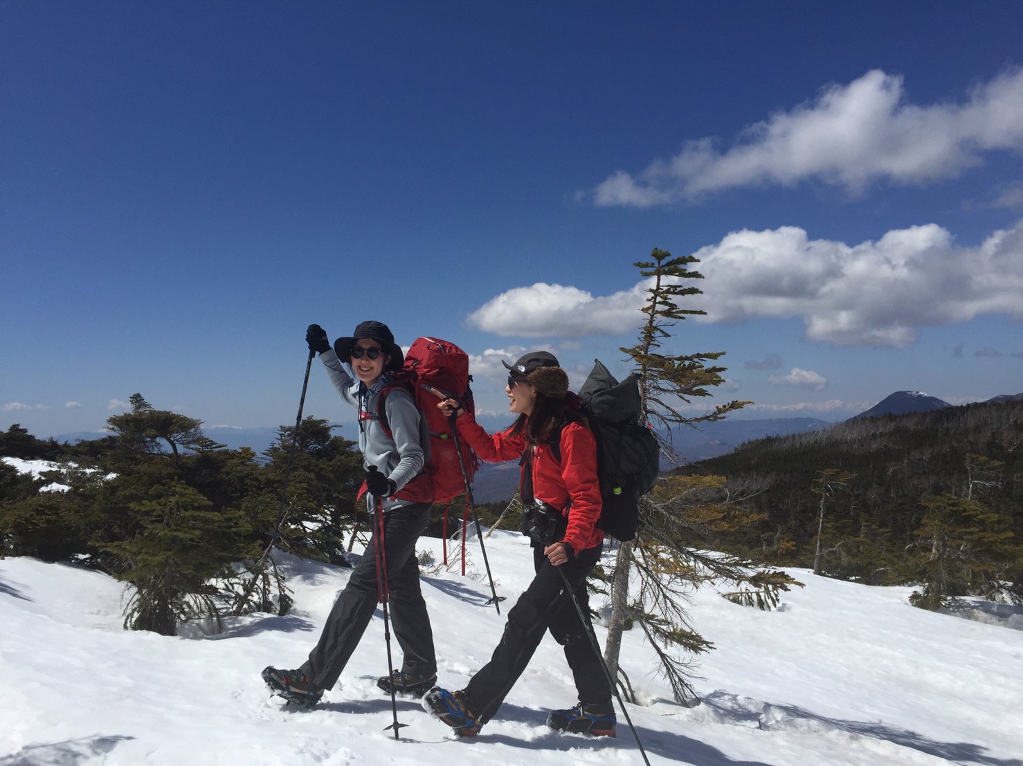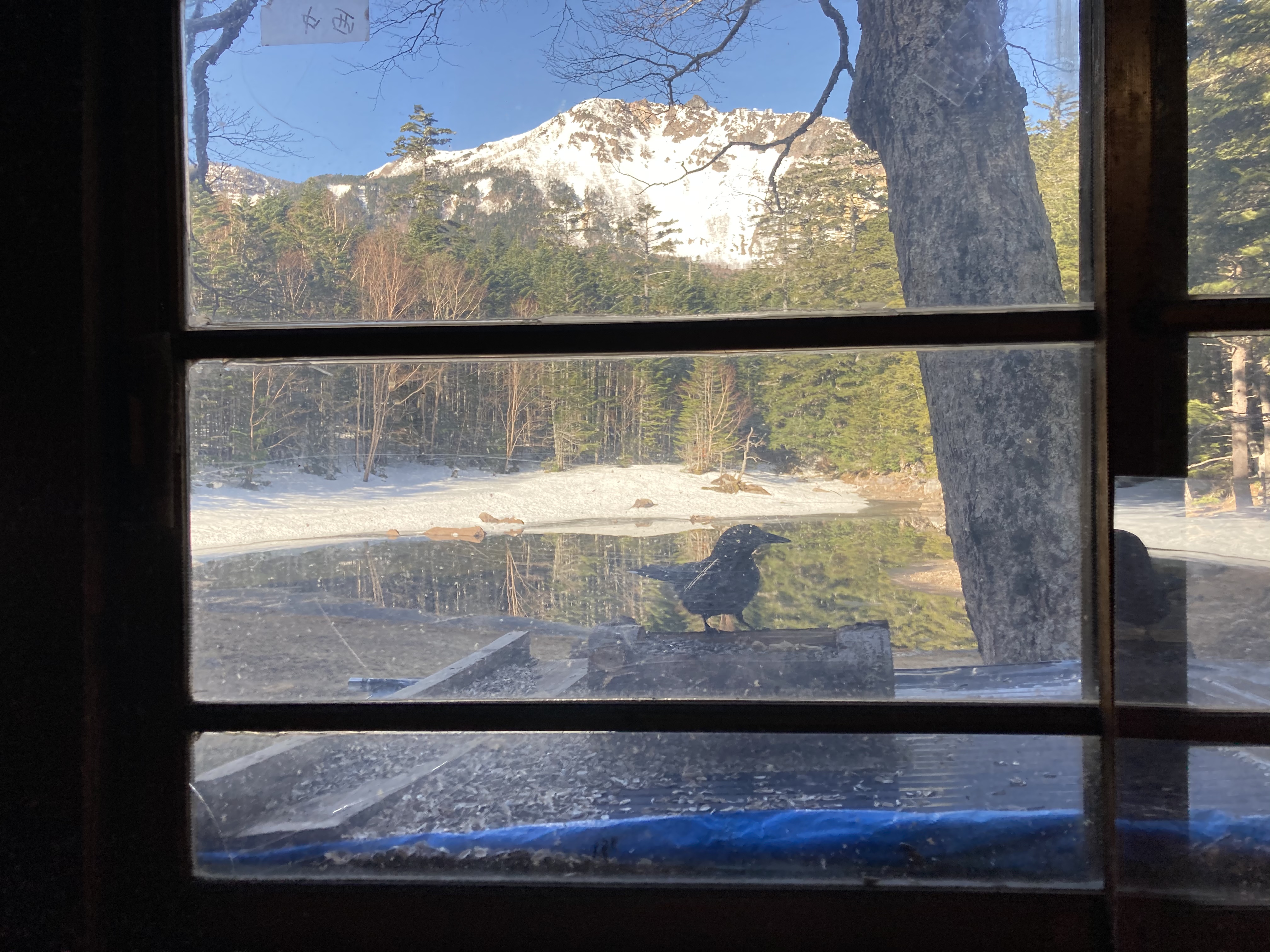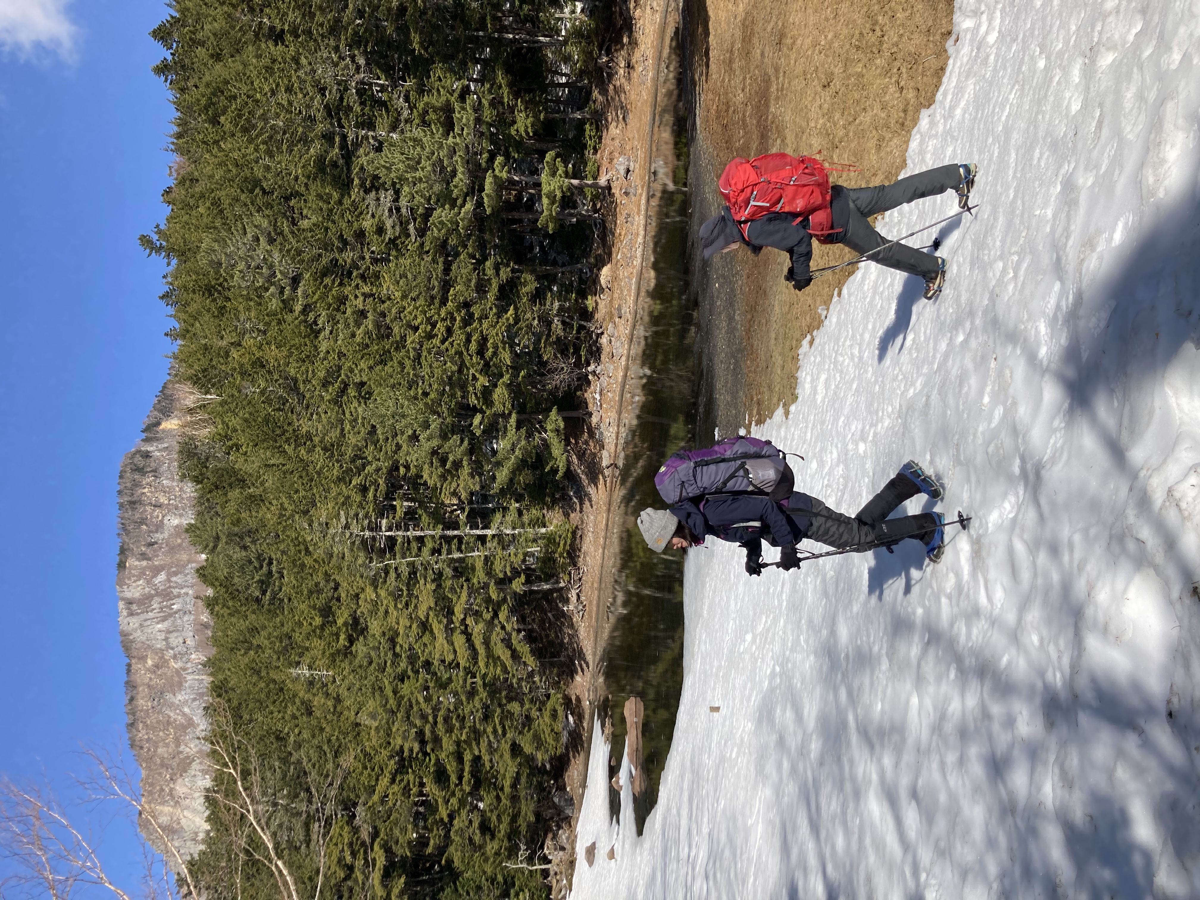 旅の始まりは、渋の湯から。噂通りの塩対応を受けて、準備をして出発!残雪期にしては珍しく、ぐっと冷え込んだため雪はしまり、ところどころ凍結していて、チェーンスパイクが大活躍。とても歩きやすく快適でした。