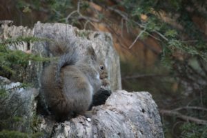 一通りナッツを食べて、『ハッ!』と私達の存在に気づいたリスは、全力疾走で森に消えていきました。そして、『人間が近いぞ!気をつけろー!』と言わんばかりに鳴き叫んでいました。