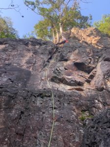 グレードはノーマル5.6、チムニー5.4で厳しくないのですが、それよりハーケンが古くてカラビナが入りにくくておい!ってなったり、立ち木の生え方が絶妙すぎて、どれをどう利用するか考えたり、、、自分で作ったアンカーが不安で急に信用できなくて怖かったです。(M戸さんにチェックしてもらってからロワーダウンしました。)