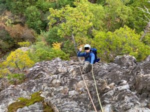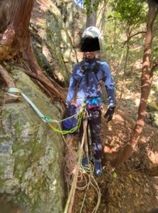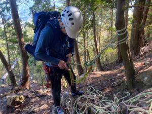 正しく行わないとリスクが高い懸垂下降、しっかりとシステムを理解して安全に行いたいものです。ロープの結び方一つをとっても、様々なノウハウが詰まっていますね。セルフをとって、ロープ通して、、、、えーっと。。。