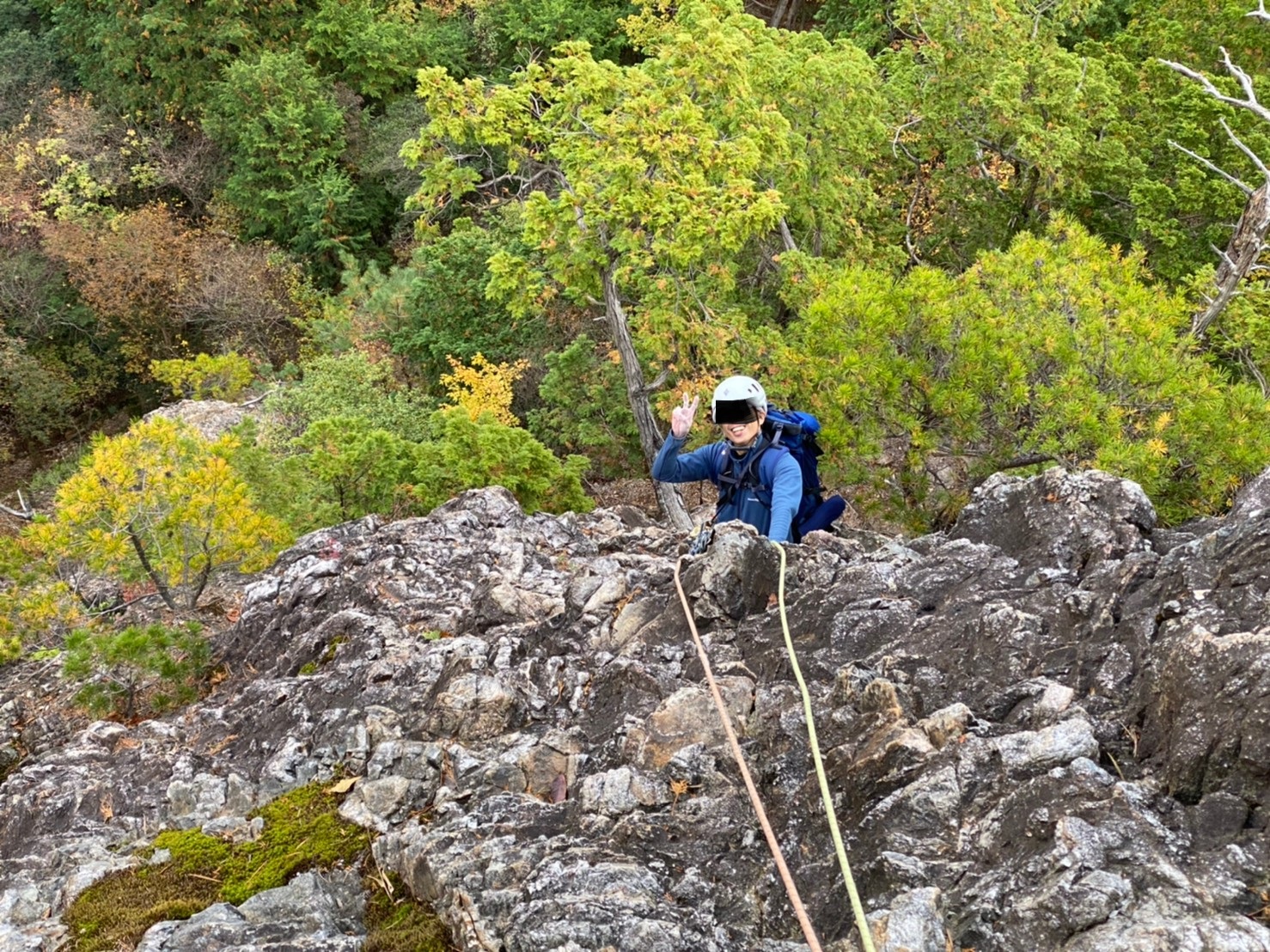 岩はとてもツルツルで。。。丁寧に登らないと滑ります。帰ってググってみると岩質はチャート。二酸化ケイ素を主成分とした非常に硬い堆積岩とのことでした。数億年前の海底を登ってきたって事ですね。