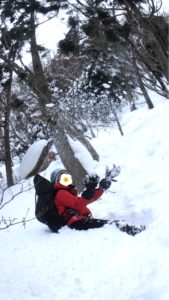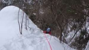 後続の二人組の力を借りながら約2間半、ふかふかの深雪ラッセルにテンション上がる。何回か踏み抜いて胸くらいまではまる。M戸さんは、命の水がきれ、足が攣るのと戦いながらぼちぼち上がってくる。