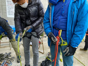 ちなみに、オモリを落下してビレイを評価するシステムは、今回は講師の方が持ってこられたものですが、滋賀県山岳連盟でも同じシステムを用意するとのことなので、機会があれば会メンバーにも経験してもらえたらと考えています。