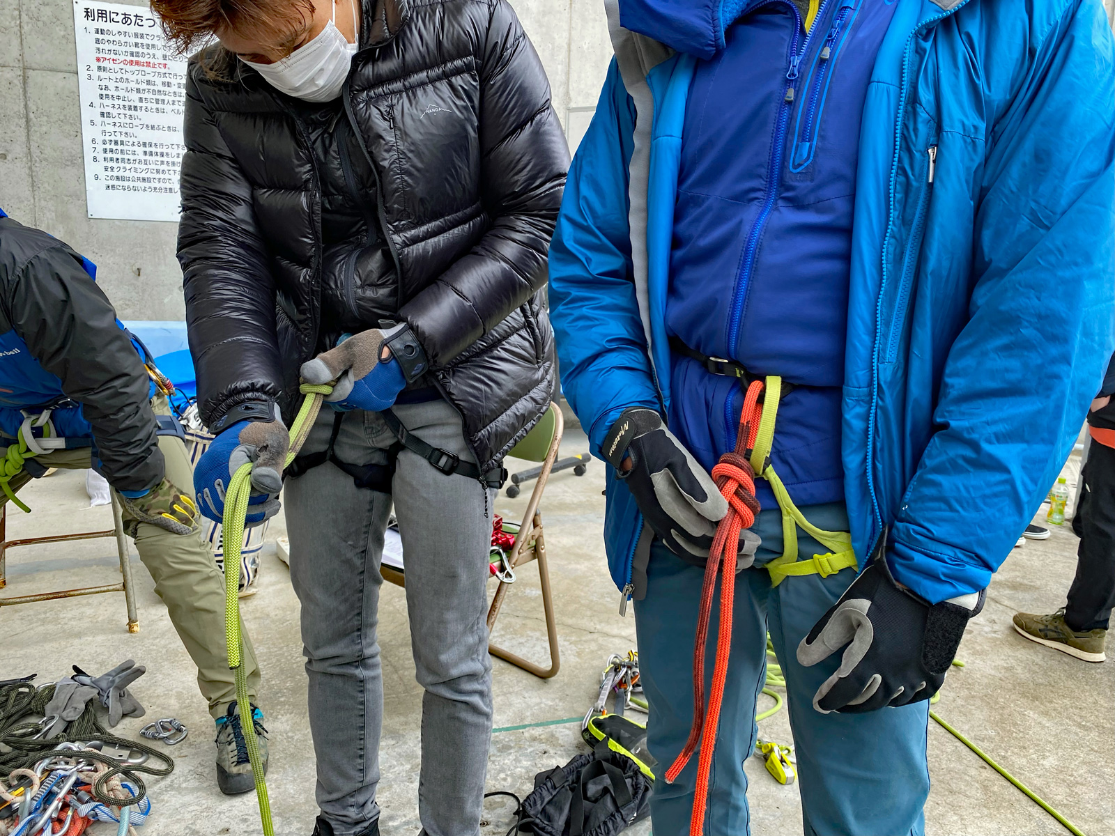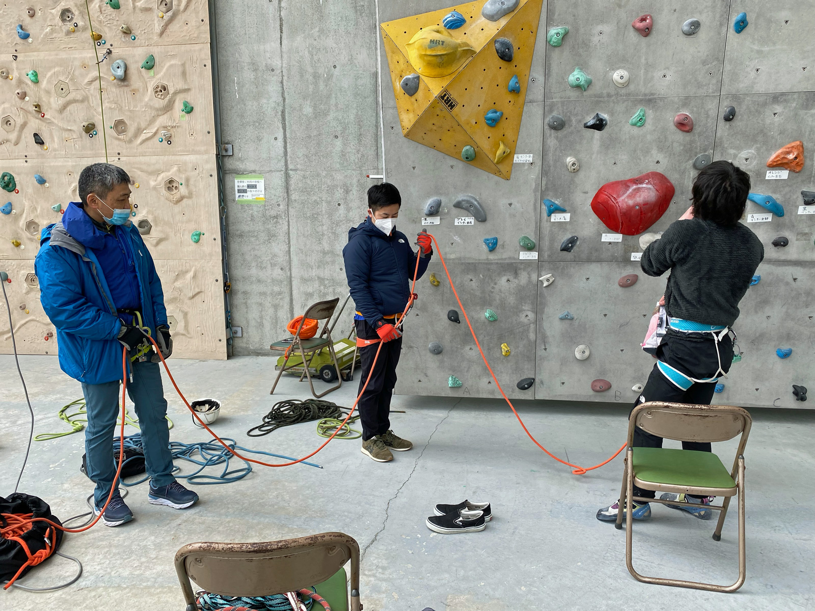 最後は、ビレイヤーのバックアップを実技で習得。大会では、ビレイヤーの突如のトラブルの際でもクライマーに怪我をさせないようバックアップ要員を必ず置いている。その所作について実技で学んだ。