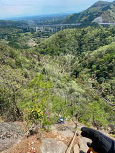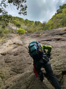 6ピッチ目は、M尾さんリードで登攀し、木登りのようなクライミングで、終了点も木でピッチを切る。連続スタカットで登攀(ピッチクライミング)する箇所は、一旦ここで終了。ここからはコンティニュアス(サイマルクライミング)で稜線まで出て、S島さんがおっしゃる「ラスボス」笑を攻めにいきます。稜線に出た途端に、15m/sは越えていると想定される強風に出会う!!