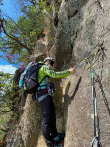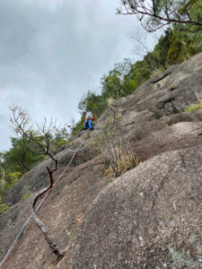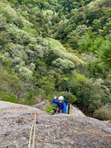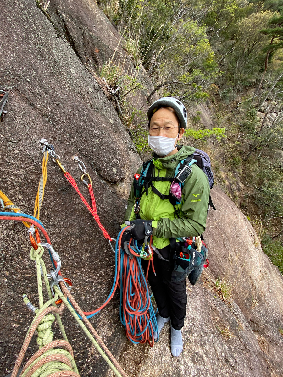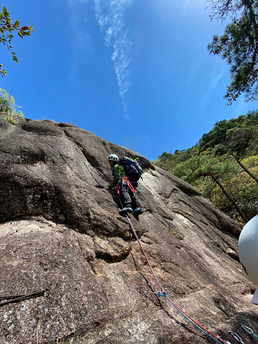 4P目は、M尾さんリード。上部の箇所が登攀難しいようで、かなり時間がかかっていました。セカンドで登っても難しかったです。木の終了点では、まだマルチに慣れないM尾さんがアンカーシステム構築に四苦八苦していたようです。ここは経験・場数が必要です。ビレイしながら次の登攀を待っている間、後から来たパーティが登ってきました。ベテランさんと思われる方が、隣で終了点のアンカーシステム構築をしている最中に、”カランコロン〜”という音が。。。?