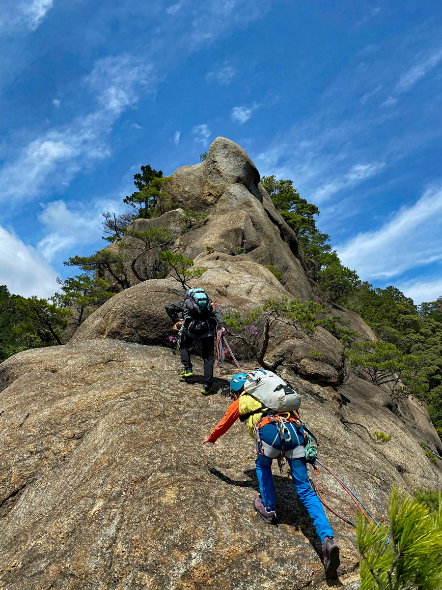 「ラスボス」をやり過ごしたら、コンティニュアスでヤセ尾根の岩場を縦走。ロープも張られてあり、安心して進めます。一定進めたら広い箇所でロープやギヤ類を外して縦走装備で鬼ヶ牙 東峰へ進みます。