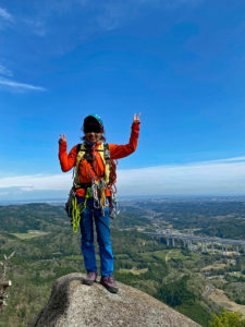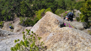 このルートの核心部である3P目(トポでの2P目)を、K林さんが登攀開始。さすがのK林さんでも初見ではノーテンで行けず。グレードで5.10cとも言われている途中にアブミを掛けてやり過ごし、その上のスラブを登ります。岩場自体は、粗い目でソールのグリップは効きやすいが、脆くてすぐポロポロ欠けて場所によりザレ場みたいになっていて、手も足も滑りやすそうでとても怖い。次の3P目はM戸リードで登攀したが、私はアブミをやり過ごした直上は滑りそうで怖すぎてA0しまくってました(>_<)。次は、岩によく聞いて、A0しないようにしようとココロに誓うのであった。。。笑笑