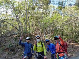 岩場には、既に7〜8人程のパーティが岩に取り付いて登攀練習で賑わっていました。岩場は少し濡れていましたが、日が当たるところで天気回復方向でもあるので登る判断をしました。1ピッチ目は横に広く、登攀ルートもいくつかあるので、空きルートで登攀準備。今回の構成は、K林-S島ペアと、M戸-M尾ペアで前進します。まずは、K林-S島ペアが登攀開始。