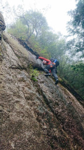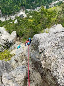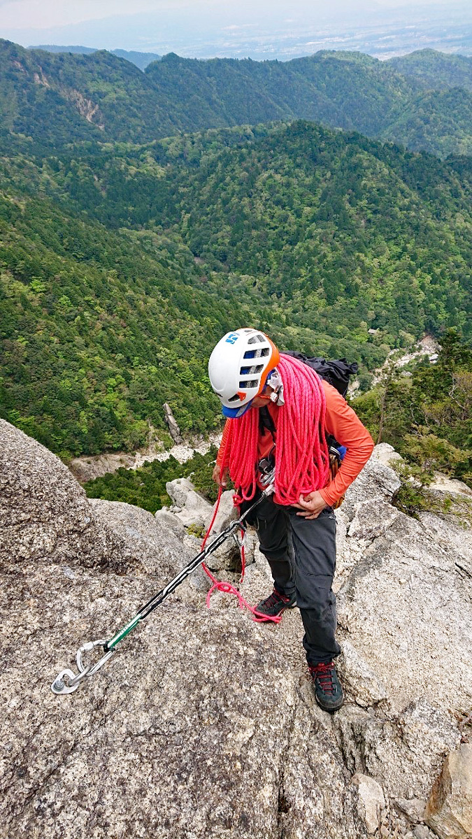 次は懸垂下降のポイントへ到着。先に二人下降した後、K野さんに懸垂下降の方法を説明し、下からS島さんがロープをバックアップしながら下降してもらいました。
