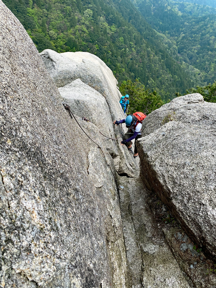 今回のルートは一般登山道ではなくバリエーションルートです。以前、接続されていたワイヤーが部分的に外されている状況になっています。恐らく、クライミング経験無い一般登山者だけの入山が増え、事故が発生したことにより、あえてワイヤーを外したのではないかと推測します。