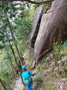 出発点の第一鉄はしごに到着。ホッチキスと呼ばれています笑。グージョンボルトも打たれていますので途中セルフ取りながら安全に登れます。出発前にK野さんにセルフビレイの取り方を説明し、M戸が先行して登攀。難しそうならスリングかロープを出そうと思っていましたが、大丈夫そうだったので前進します。途中の少し切れ落ちたトラバースはリスクが想定されたのでロープを出してフォローしました。切れ落ちはちょっとのことなのでクライミングスキルあれば何のことは無いのですが、もし落ちると大けが以上になるようなところなので安全確保して前進です。