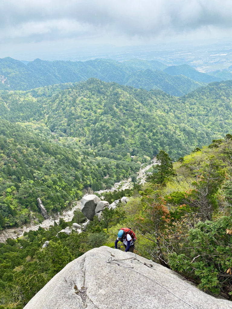 ここのヴェア・フェラータは、クライミングスキルがあれば、登山靴やアプローチシューズで十分登れるレベルです。今回、K野さんには必要に応じてロープやスリングでフォローしながら登ってもらいました。