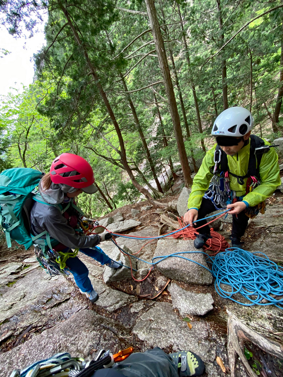 P3終了点で、岩にメインロープを巻いて