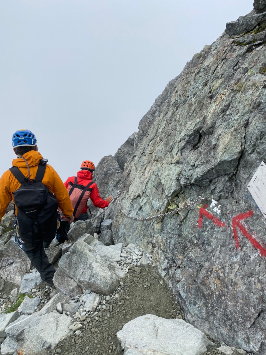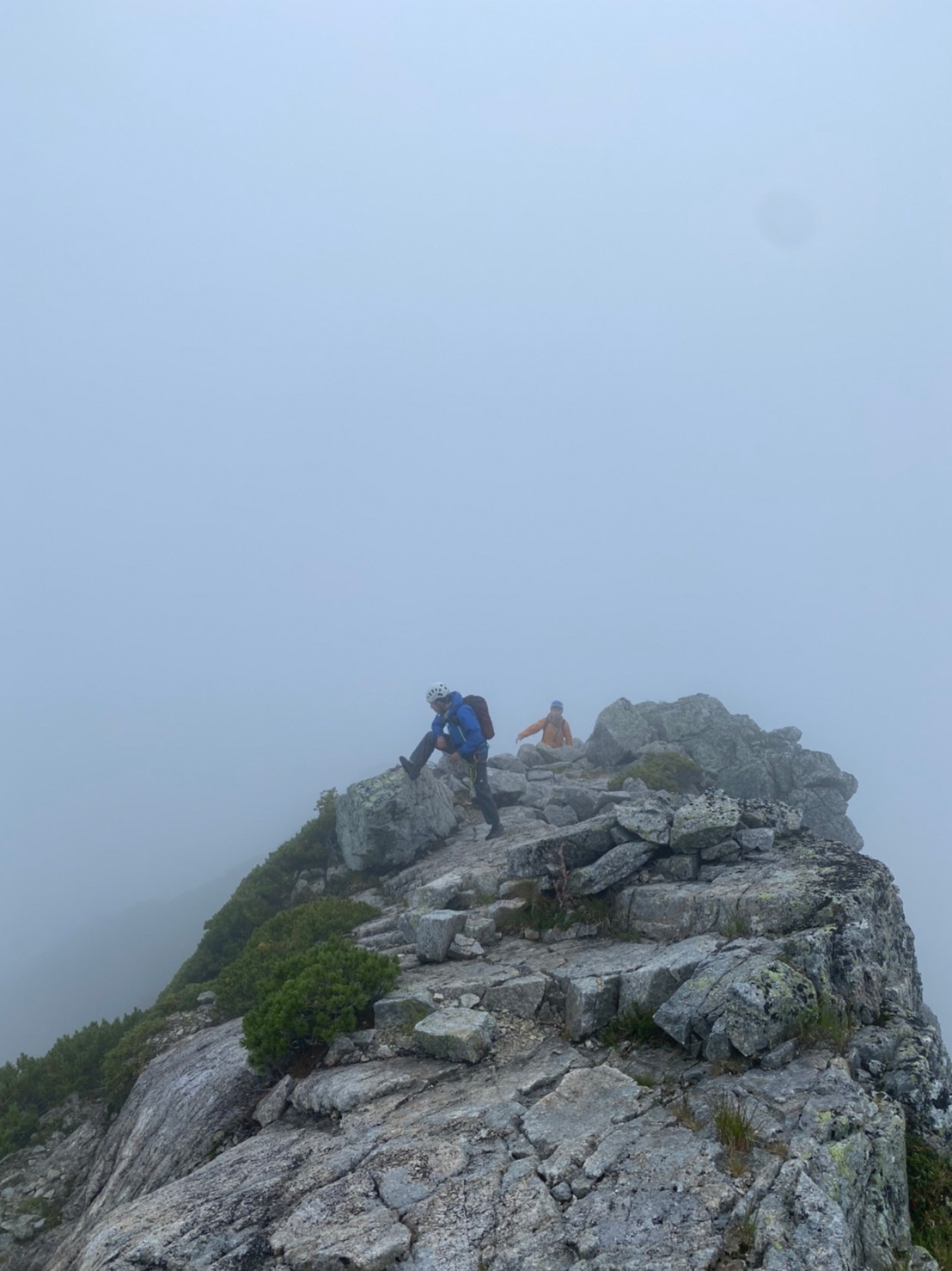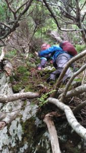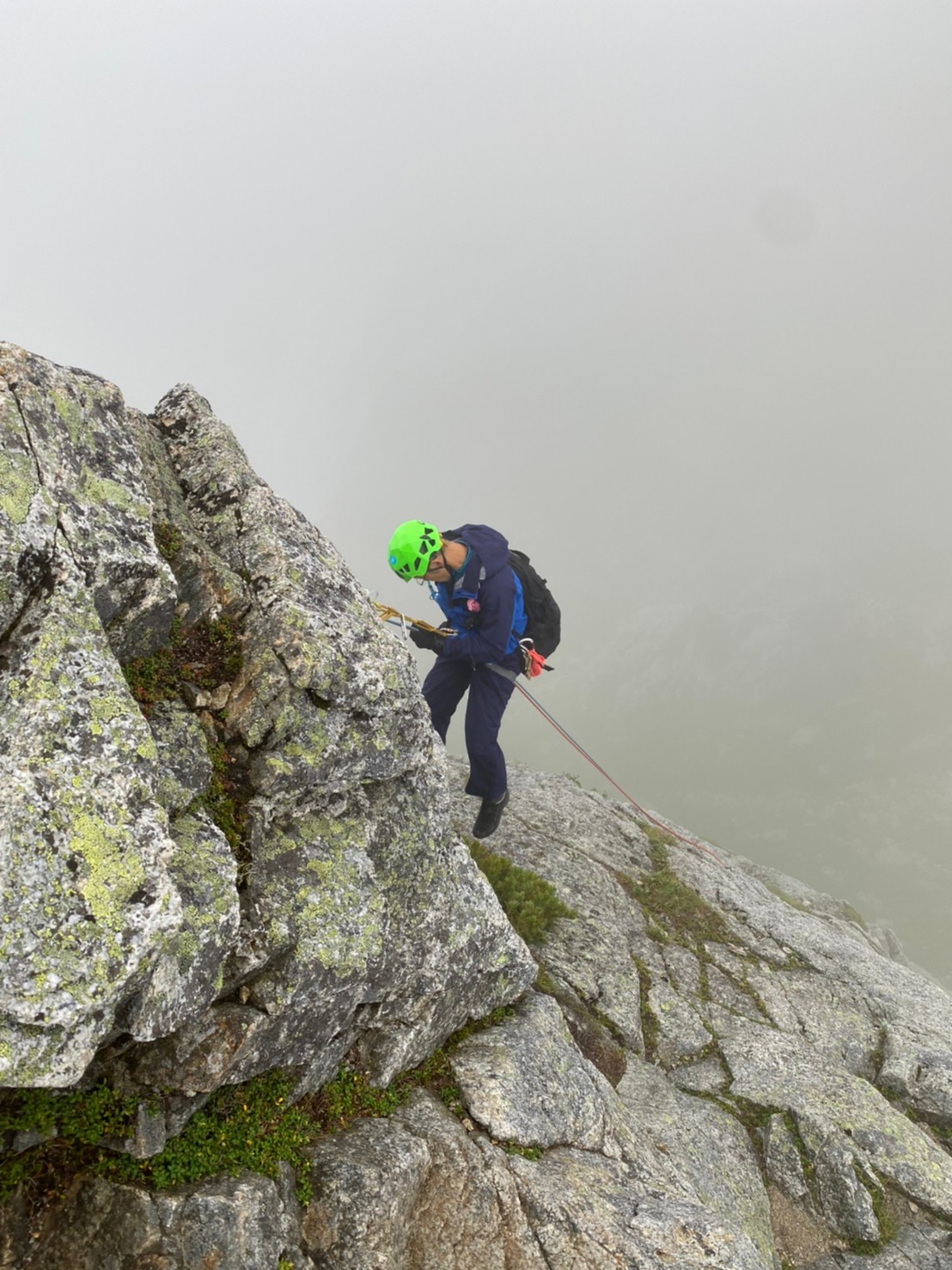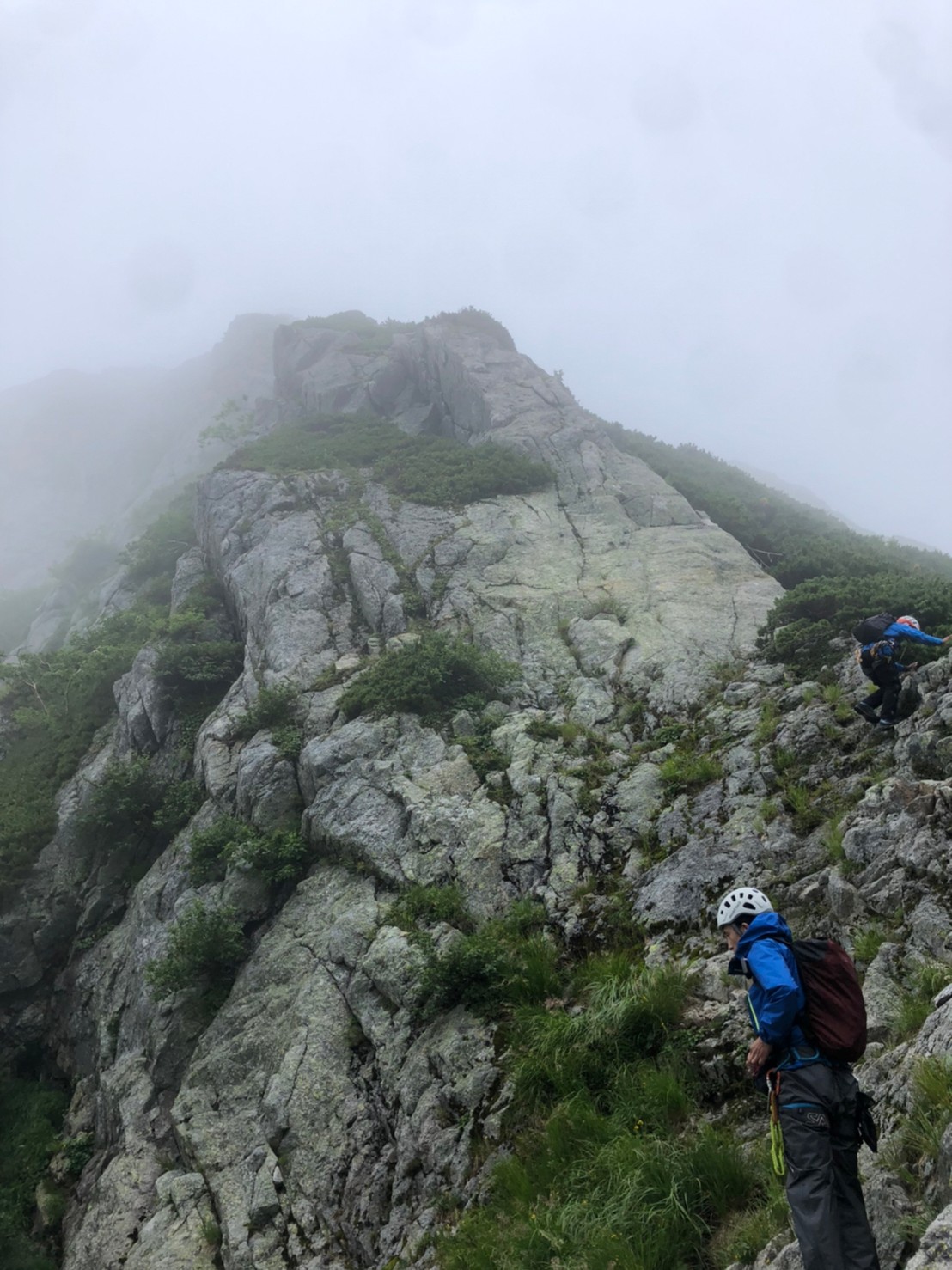 Ⅰ峰登頂、写真撮影途中くらいからガスが巻きはじめ、眺望はきかなくなるが薄いガスで雨にはならず助かる。順調にⅡ峰登頂し、懸垂下降。支点は新しいリングボルトが3本もある。懸垂後はk林さんが先頭となり進む。Ⅿ尾さんがコンパス使用し読図しルートファインディングをサポートするなど、チームワークを感じさせる。見事読み切り、頂上直下ルートで登頂!