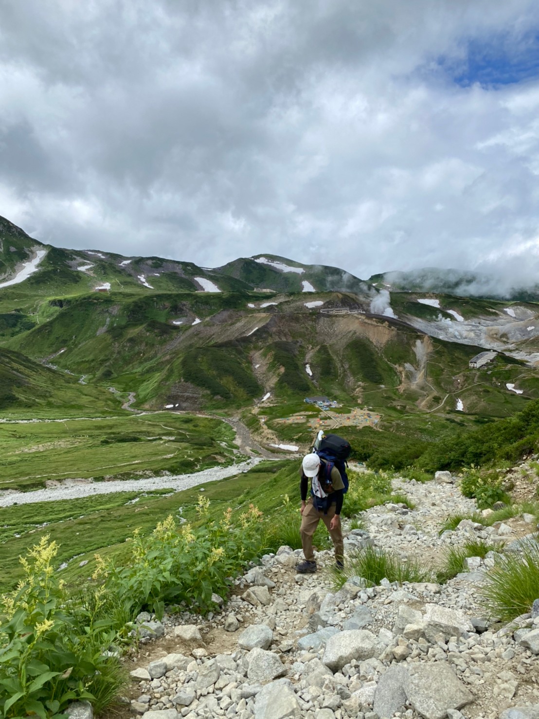 雨あがっており、曇り~薄霧。朝食を済ませさっとテントを撤収。事前計画では3日目に立山縦走としていたが、午前霧・午後雨の予報にて前日にはパスと決定済みにて、わずかに見える剱岳山頂の輪郭に別れを告げて室堂への直行下山開始。剱御前小屋から雷鳥沢キャンプ場へ下り始めて20~30分程経ち、Ⅿ戸さんの野外トイレ待ちの間にF谷がお金・免許証・保険証の入ったジップロックが無いことに気づき、単身空身で剱御前小屋トイレに登り返し、雨の中メンバー待機約1時間のミスあり。その後はしっかりとした雨の中、ドボドボになりながら室堂センターに到着。温泉、昼食をまったりと過ごし帰路につき、米原の暑さに驚いて解散となる。