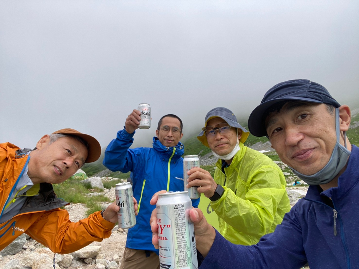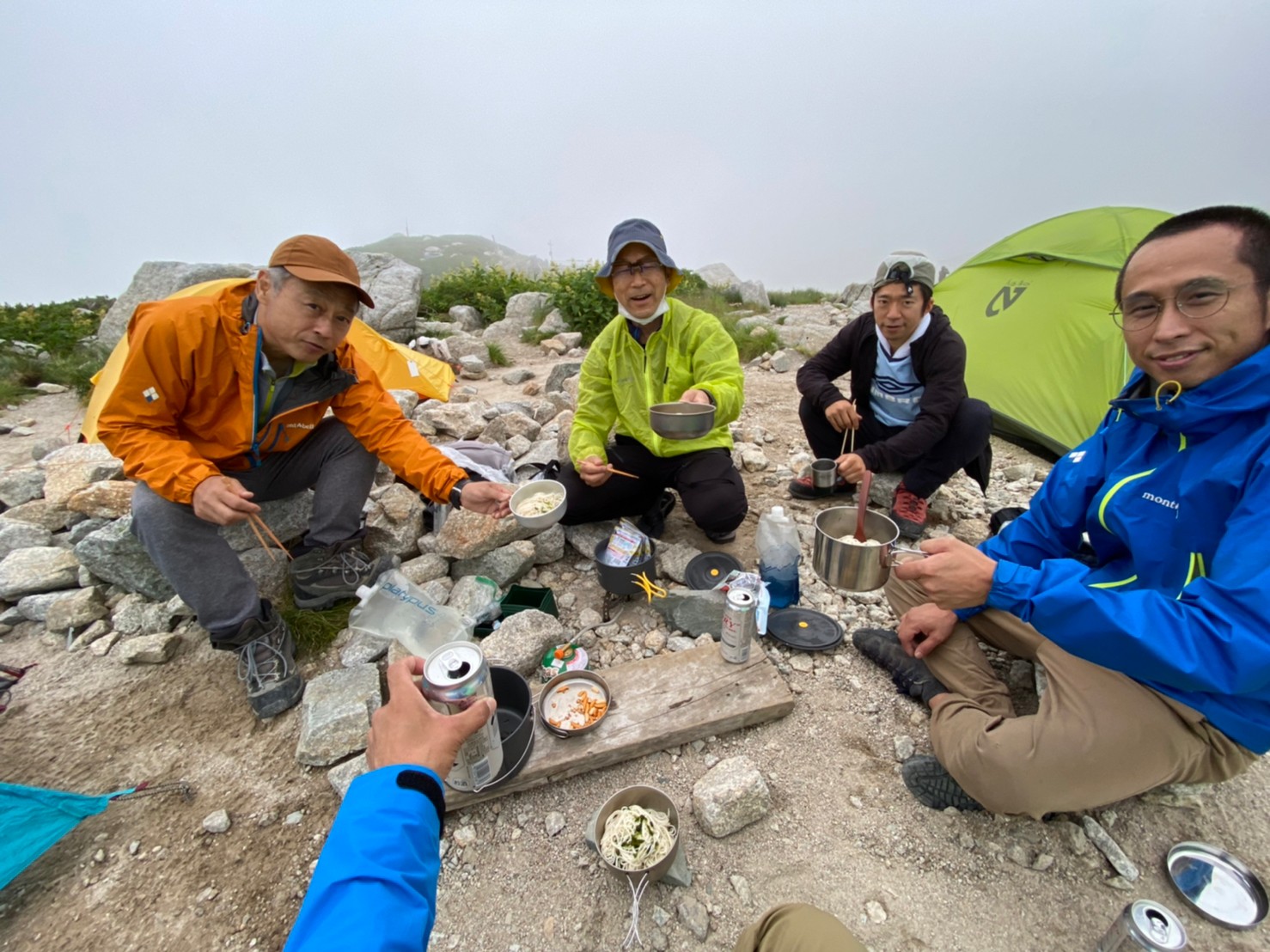 事前計画では剱沢キャンプ場にテント設営後、天候がよければ翌日登る源次郎尾根の取りつきの偵察となっていたが、ガスが出てきて視界不十分の為見送りとなる。雨はまだ降らず、剱沢小屋でビールを購入し、テント外での調理・夕飯(あおさのりソーメン&カルボナーラスパゲッティ)となる。食べ終わり頃に小雨がぱらつき始め、各自テントに入り就寝。F谷は頭痛と倦怠で軽い高山病の様になりⅯ戸さんよりOS-1粉末の提供と深呼吸のアドバイスを受け、6時頃には復活。夜は風雨あり、ツエルトのK林さんは濡れながらやり過ごしたとのこと。6テンの3人は広々と快適に眠れた。