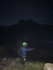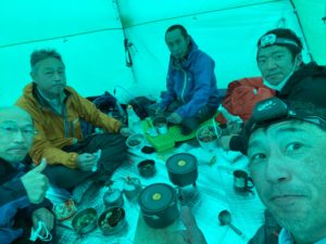 夕食後各自テントに戻り、就寝態勢となるが風雨はおさまらず、ツエルト泊を強行していたK林さんが水を掻き出しても追いつかないとのことでテントに避難し、就寝となる。