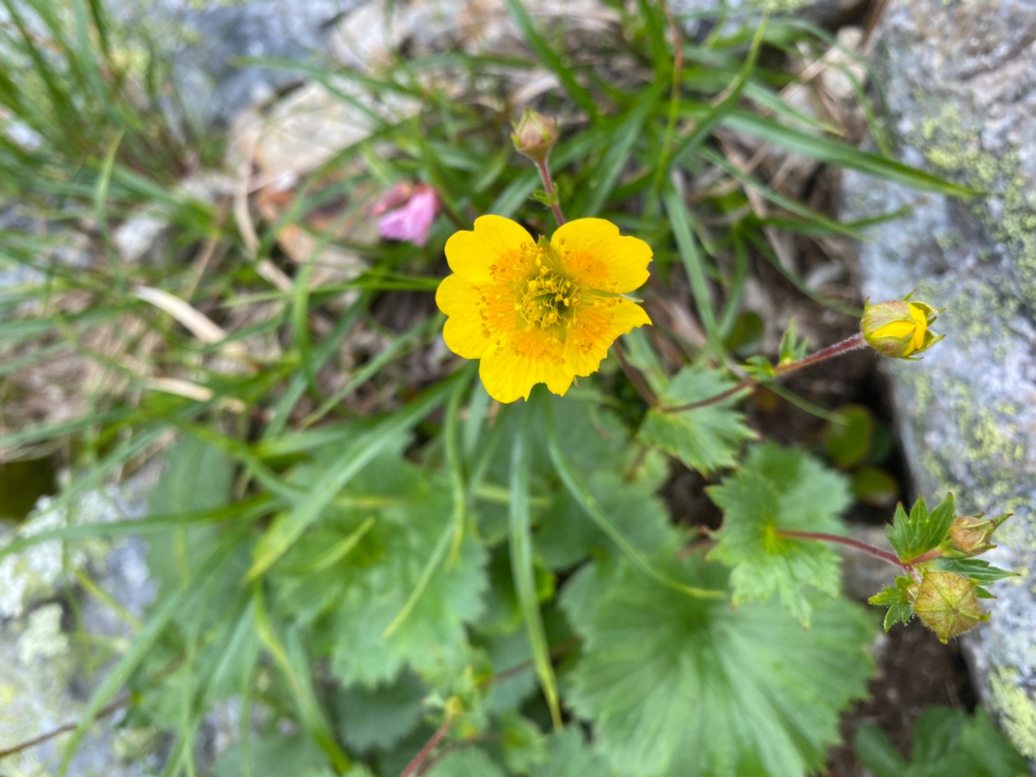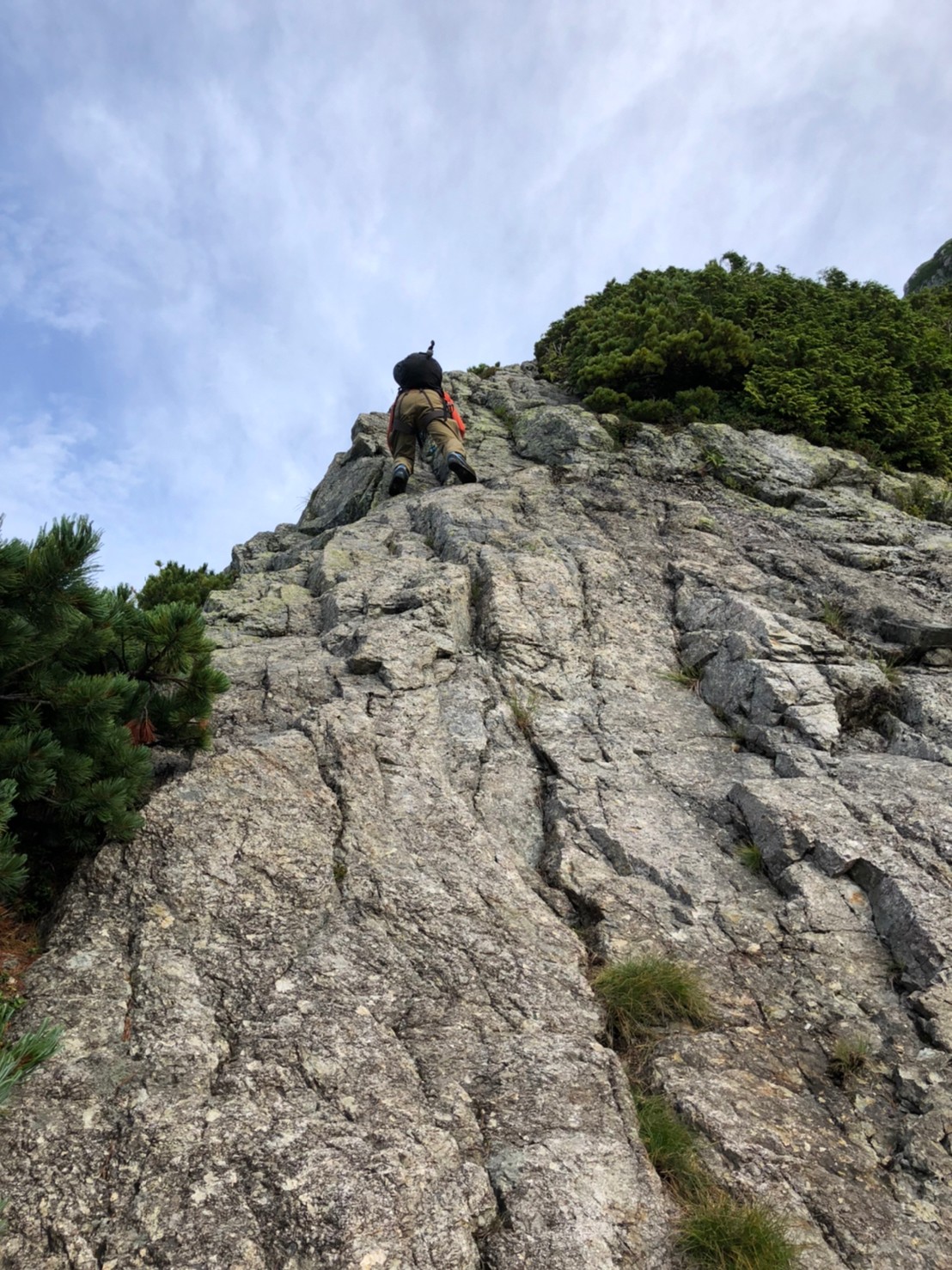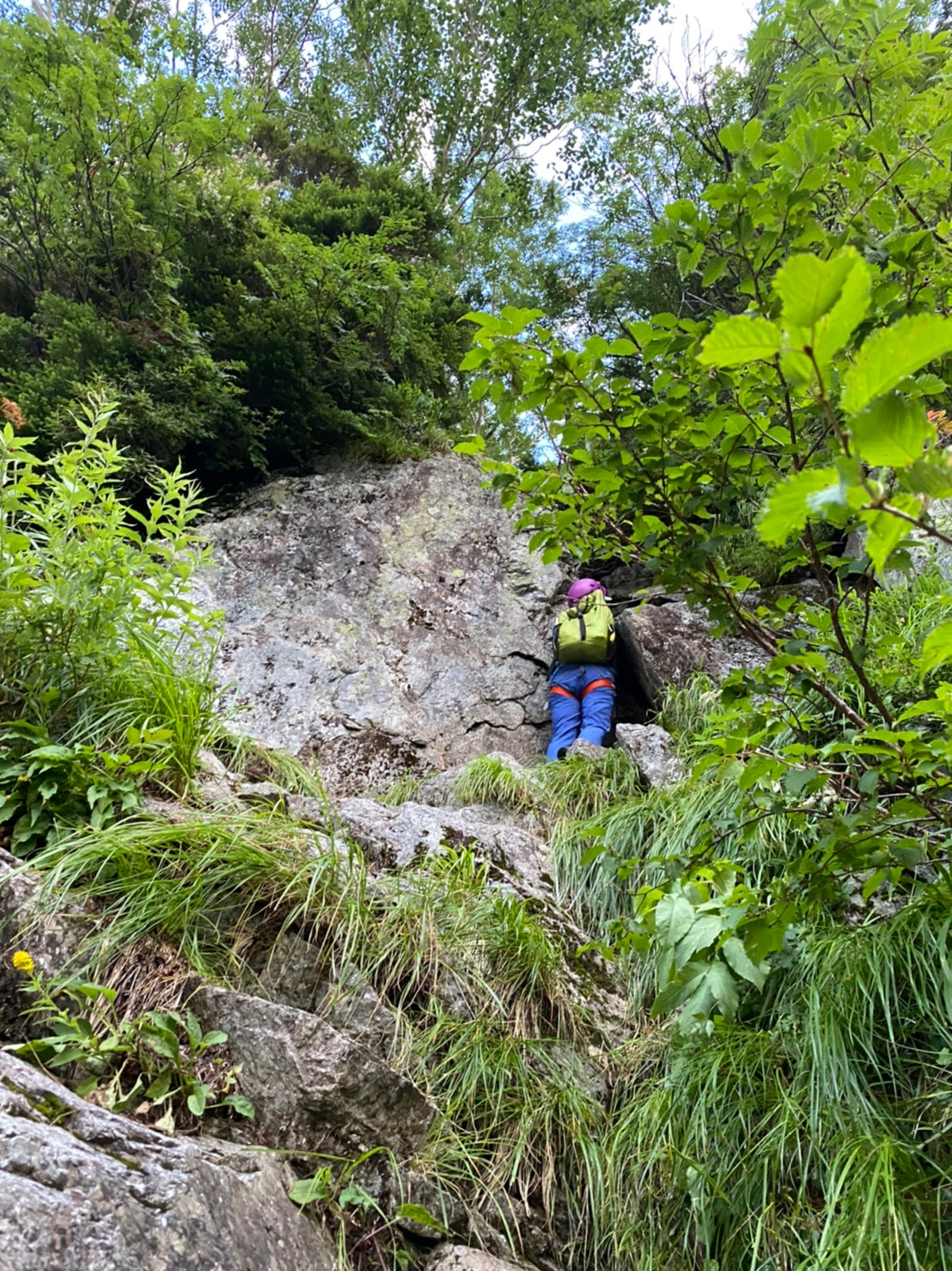 剱沢雪渓は安定し、取り付きも容易に確認でき、源次郎尾根登攀開始。取り付き直後の岩場で体慣らしを済ませると、先行パーティ一組を追い越し先頭パーティとなったため、その後は待ちなくスムーズになる。Ⅿ戸さんが灌木の中をルートファインディングしながらぐいぐい進む。木登りも面白い。灌木帯を抜けると岩稜とハイマツの混じった斜面となり、晴れているため周囲も見渡せ、高度が増す尾根の爽快さがたまらない。時折りクライミングの要素も交じったり険しい雰囲気の場所もあり、ここちよいスリルと疲労を感じるが、所々に咲く花にも心が和み、あー楽し~。