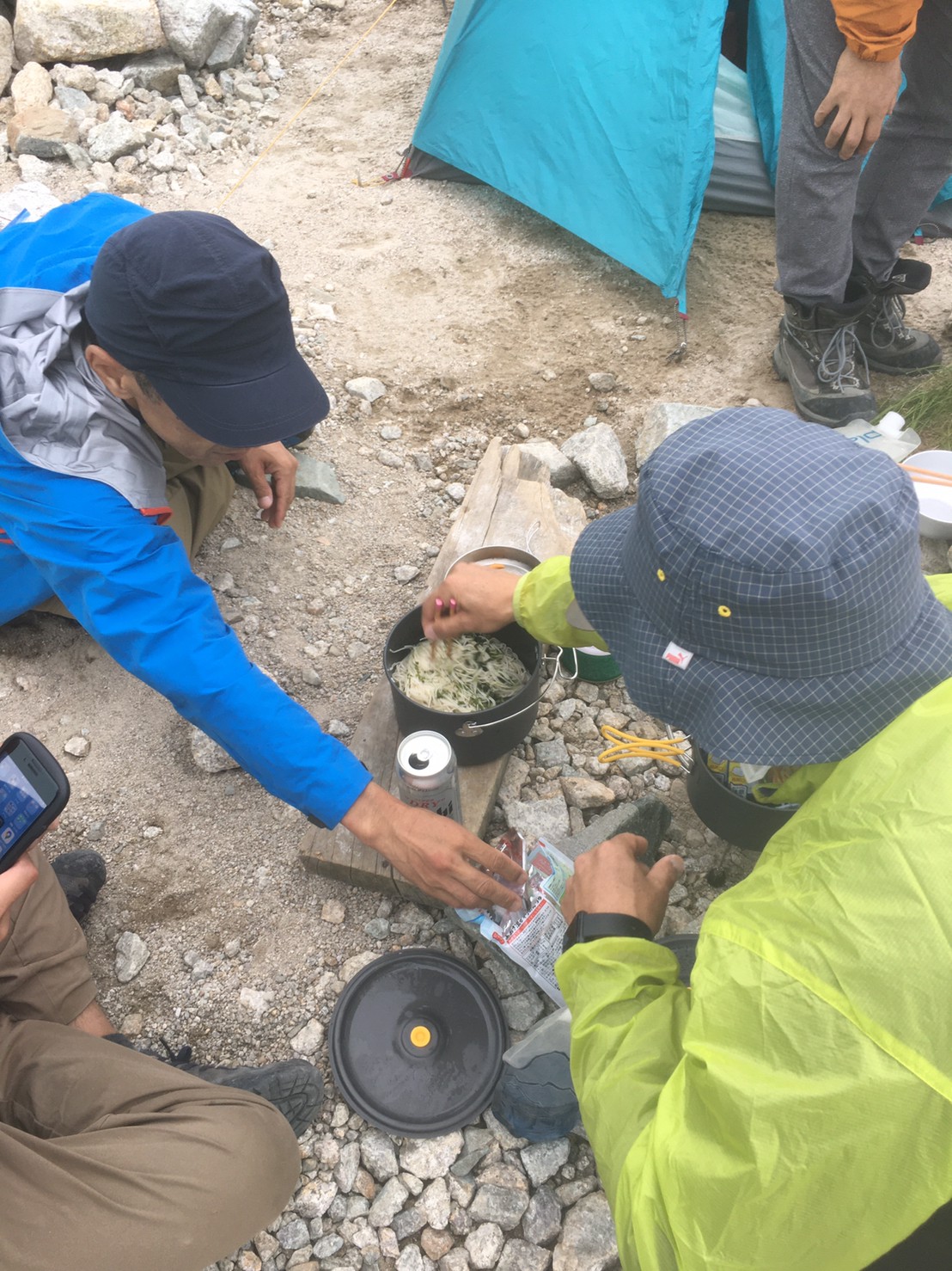 平蔵のコル手前で雨がぱらつき始め、平蔵のコルで正式に南壁登攀はパスとなり、クライミング装備解除。全員で剱沢キャンプ場への下山となる。剱山荘あたりから雨脚が強くなるが、断続的でドボドボにはならずにベースキャンプに到着。風雨がかなり激しくなる中、難産の釜めし、ハンバーグ、オクラ入りの味噌汁の夕食をいただきながら一日を振り返ったり、過去の山行・今後の山行について話し合う。