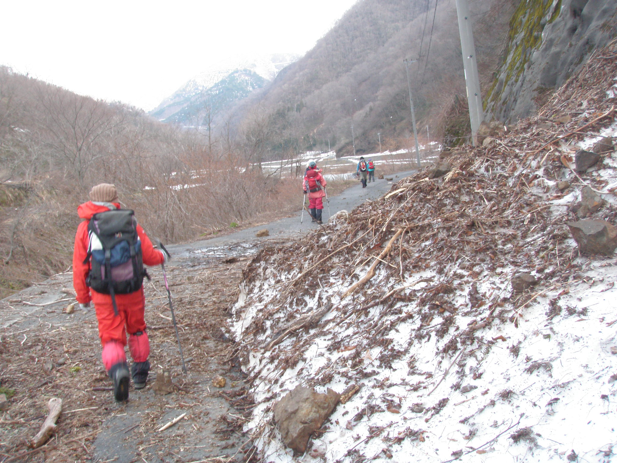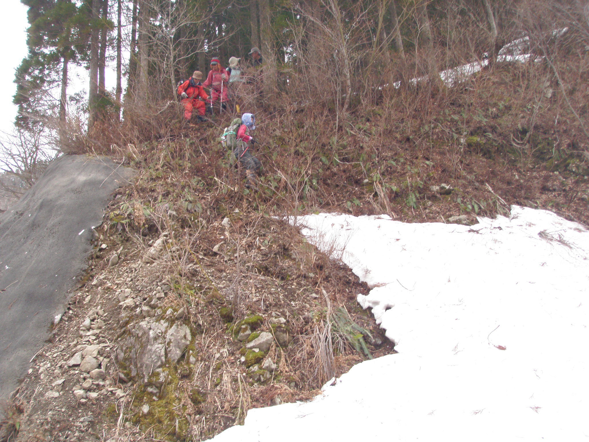 無事車に辿り着き、朝出会ったワサビ採りの男性が朝の約束通り一袋ワサビのプレゼントが有りました。ワサビは良く洗い、熱湯は掛けるだけで、好きな調味料で頂きます。この時期は一部藪が出ていて、危険な斜面を行かざるを得なくザイル確保しました。時期が早ければ藪は有りませんが、林道で土砂混じりの雪に埋まります。急斜面を滑落して谷迄落ちるか、土砂や雪に埋まるか好きな方を選びましょう。