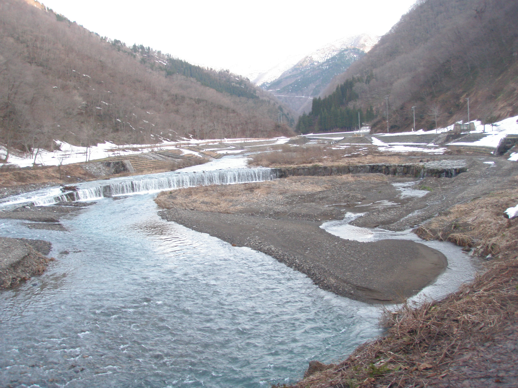 ダムを通過したら、すぐに椀戸谷出合です。林道は雪で埋まっており、アイゼンを装着します。