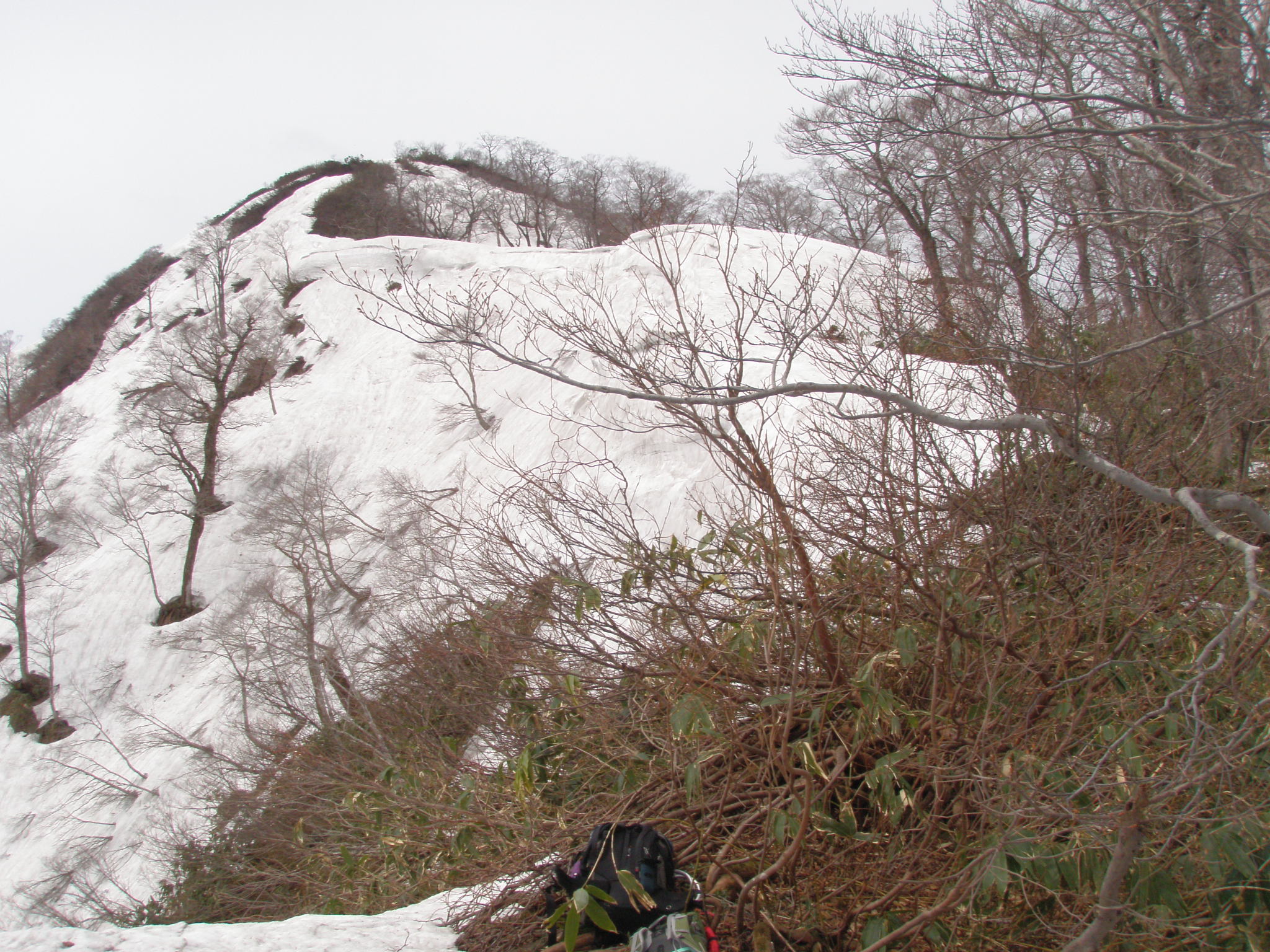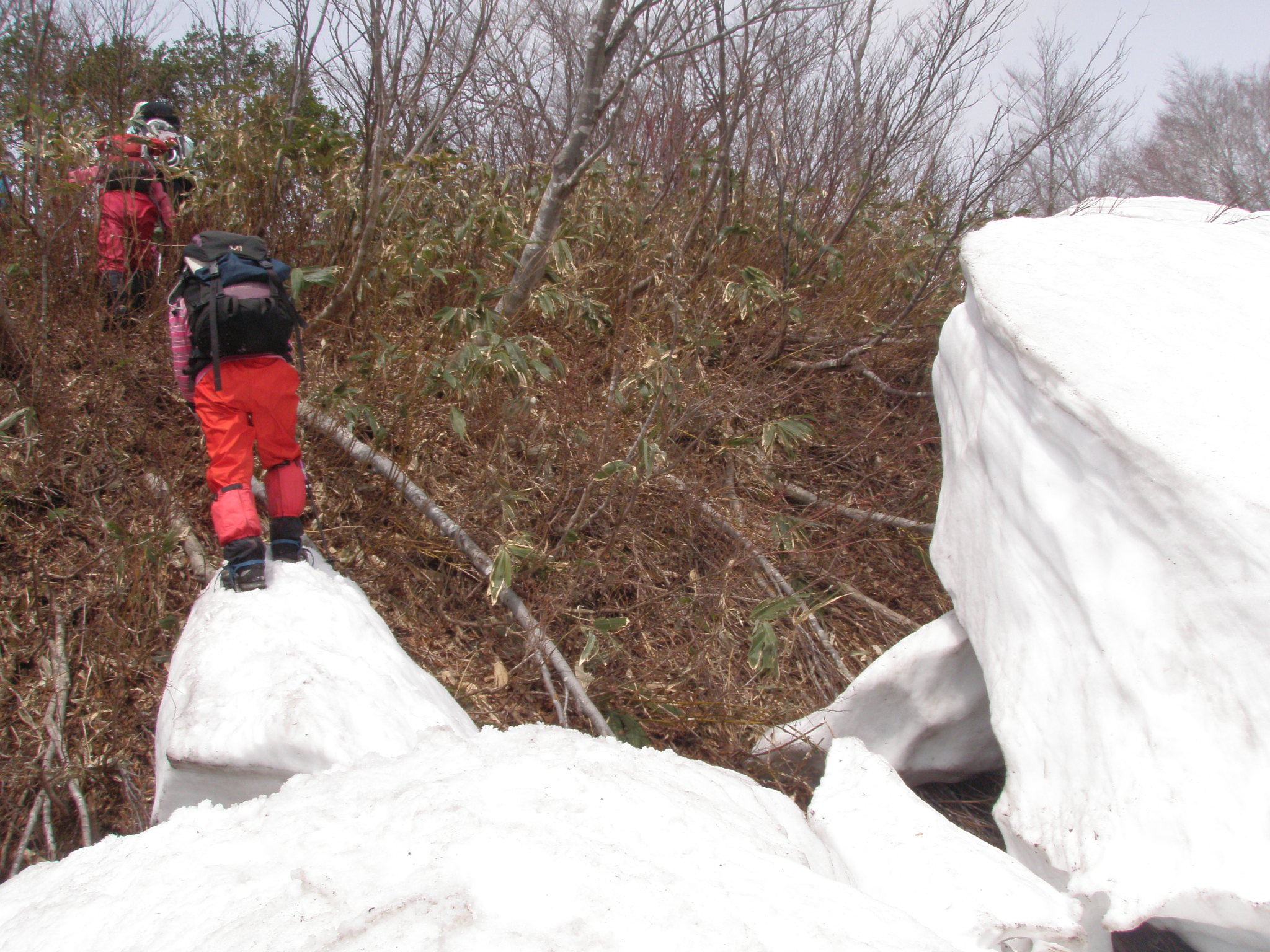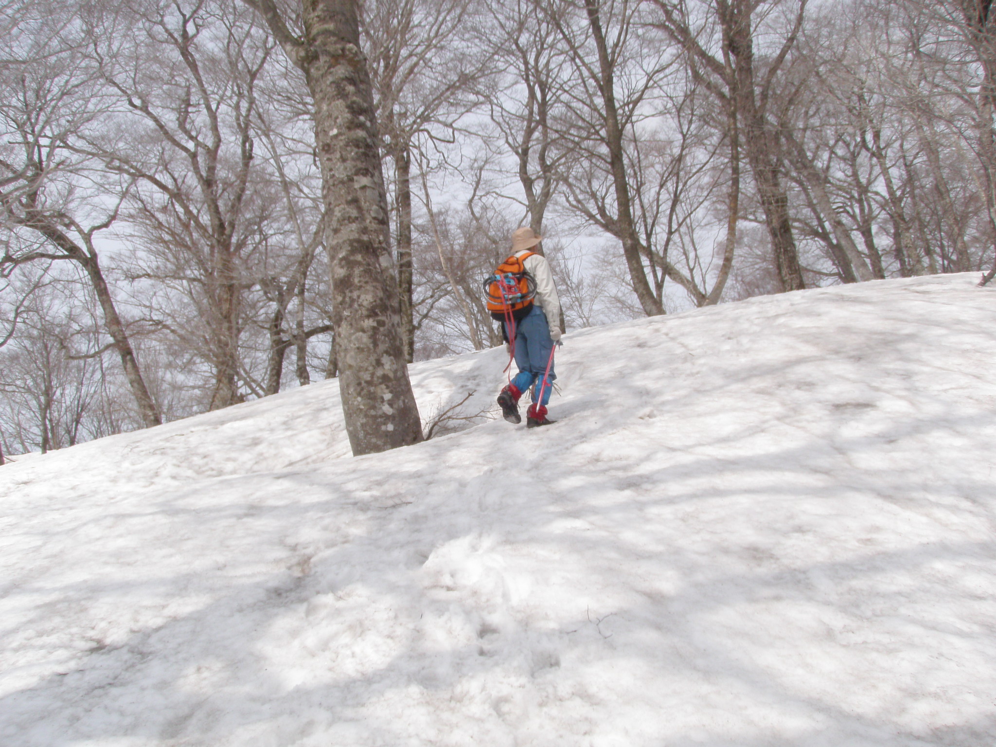 尾根が合流したら傾斜は緩く成り、大きなブナが林立した気持ちが良い所です。P1114の手前は一部雪が落ちて藪の中を進みます。