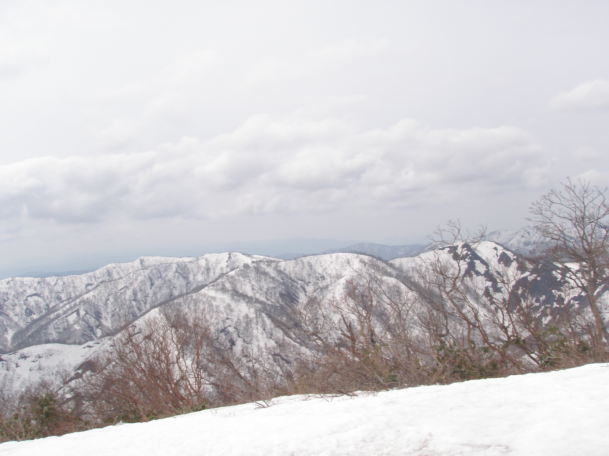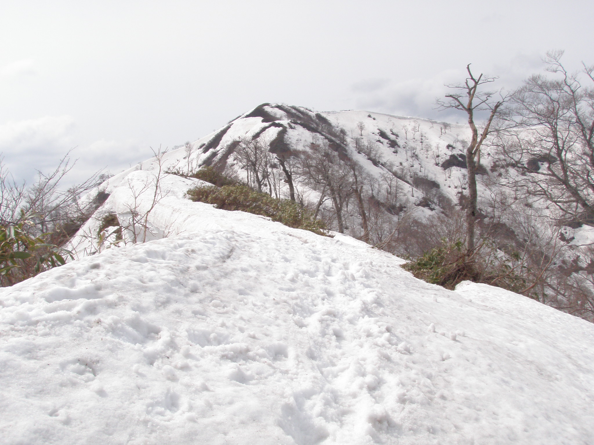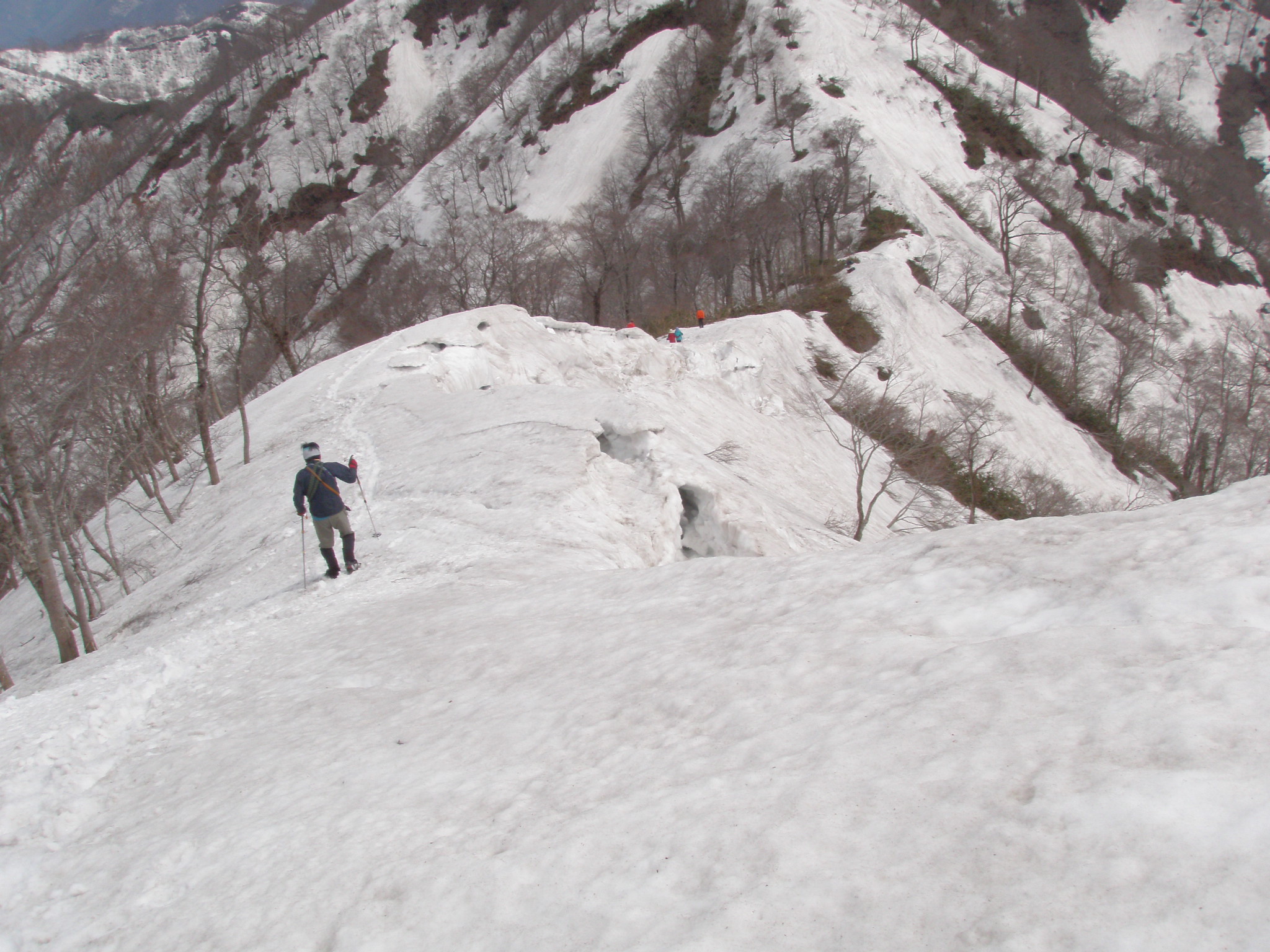尾根が合流したら傾斜は緩く成り、大きなブナが林立した気持ちが良い所です。P1114の手前は一部雪が落ちて藪の中を進みます。