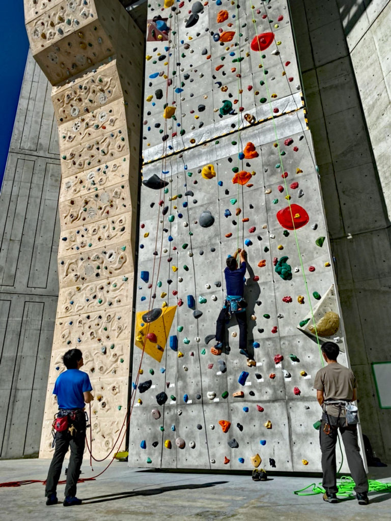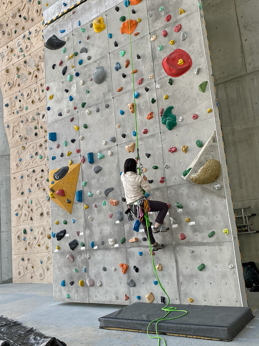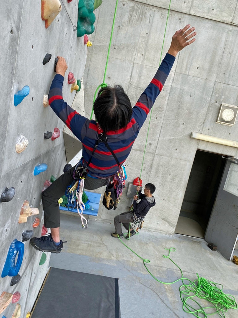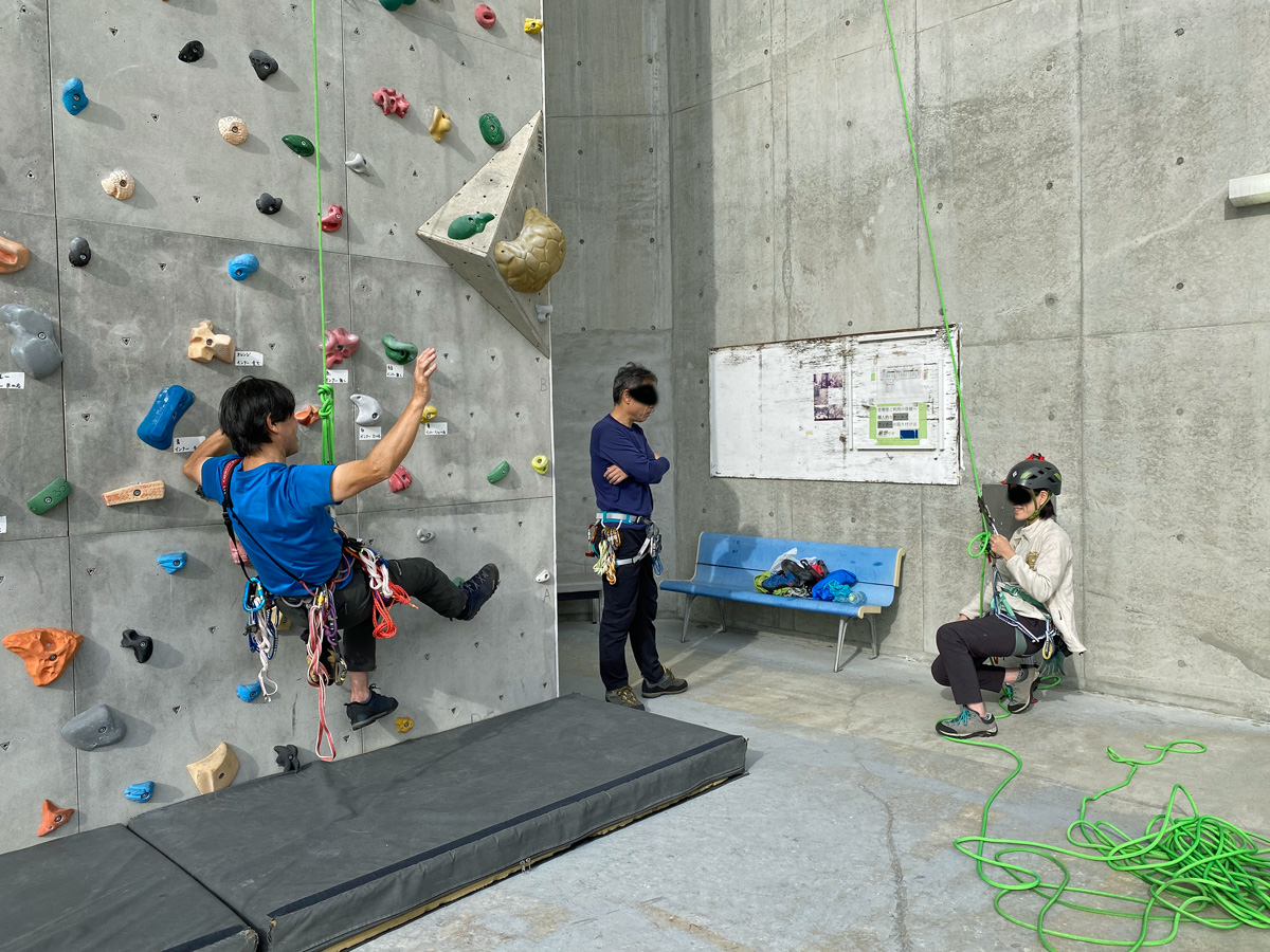 可動壁の右側を登攀するN澤さんとビレイするM戸