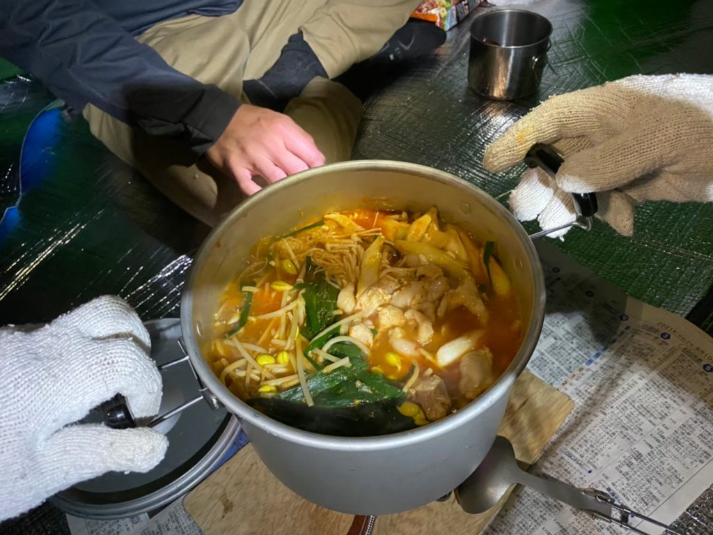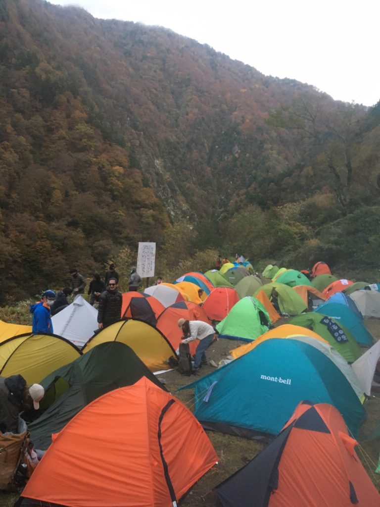 既にテン場は人でいっぱい。先に着いた上り隊がかろうじて場所を確保してくれていた。なんてったって巨大8テン。上り隊の皆さま、重ね重ねありがとうございます!