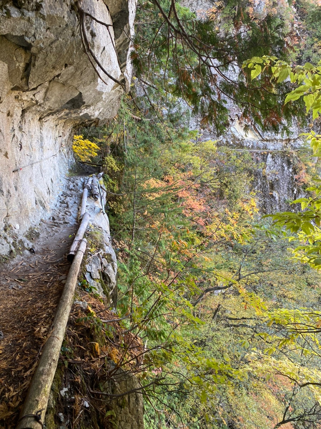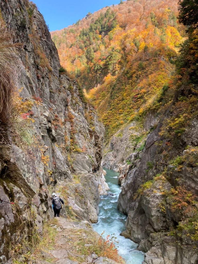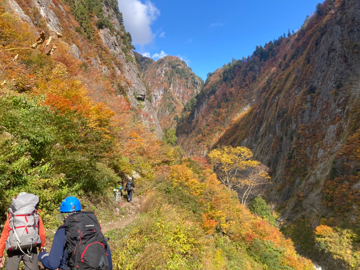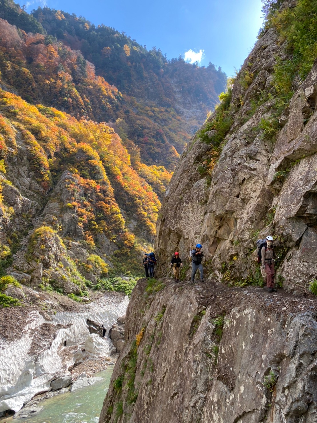 多少のUpDownはあるものの、ほぼほぼ水平(に感じられる)登山道を進むにつれて黒部川がどんどん遠くなり高度感抜群が増すルートですが、この辺りは道幅も広く、紅葉のハイキングを楽しむ感じで歩ける。