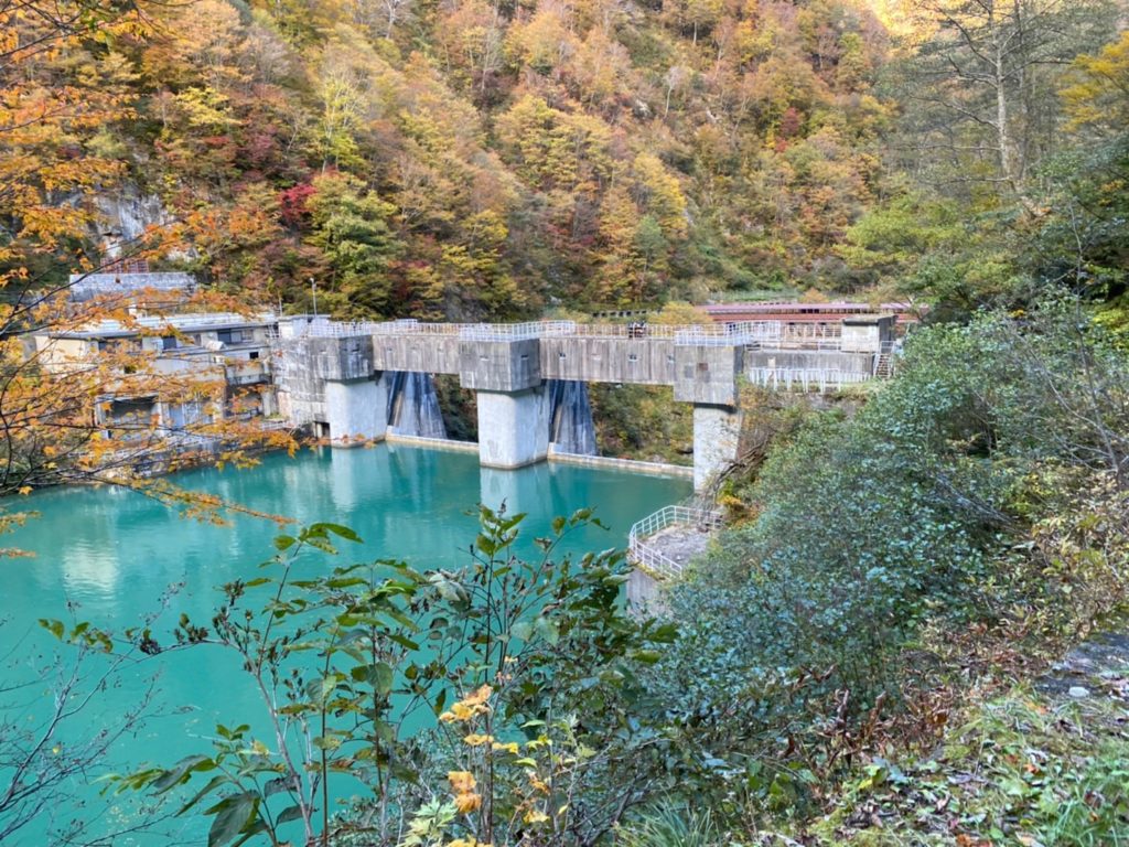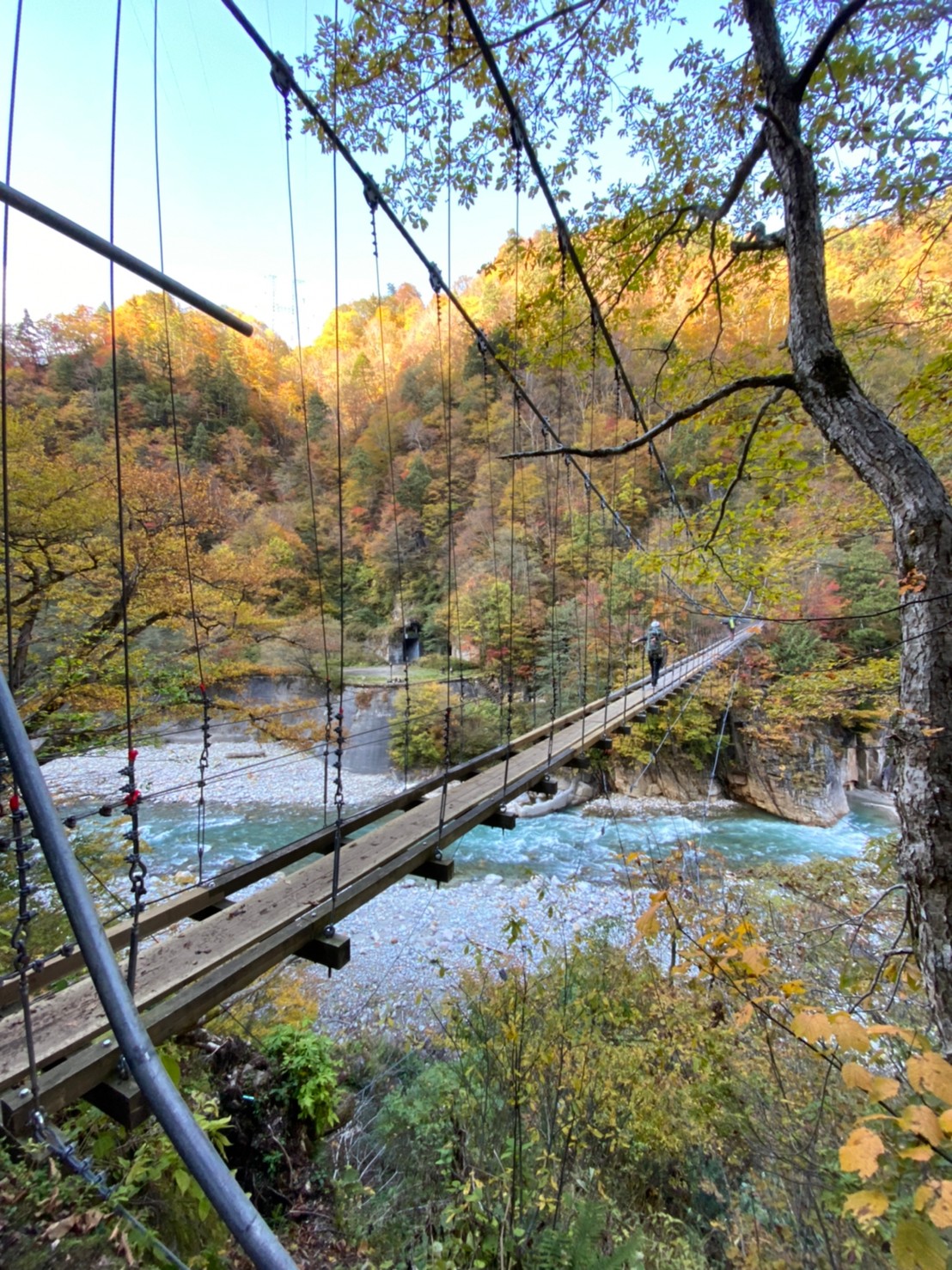 写真で見るとさわやかな青空と紅葉に見えるけど、下を見下ろすと、はるか下に黒部川が…。緊張感が増すから、怖くて下を見られない。