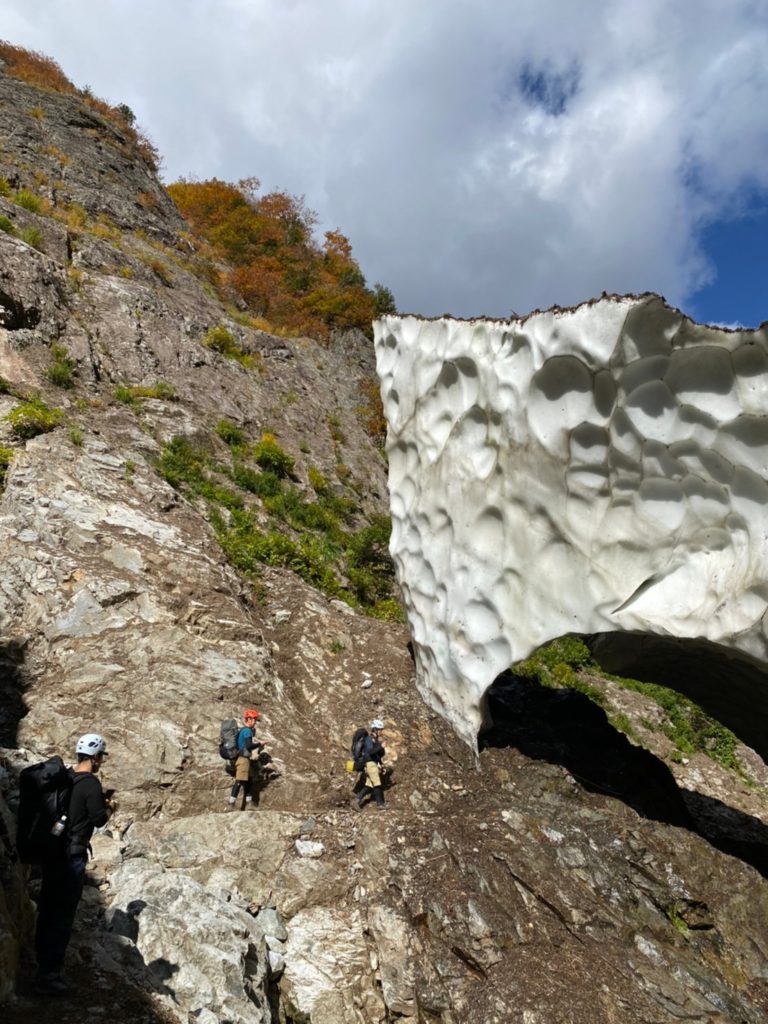 ドーム状に残った雪渓のトンネルを抜ける。距離にして5~6mくらいかな。これ、いつかのタイミングでは崩れるんだろうなと思うと自然に早足に。