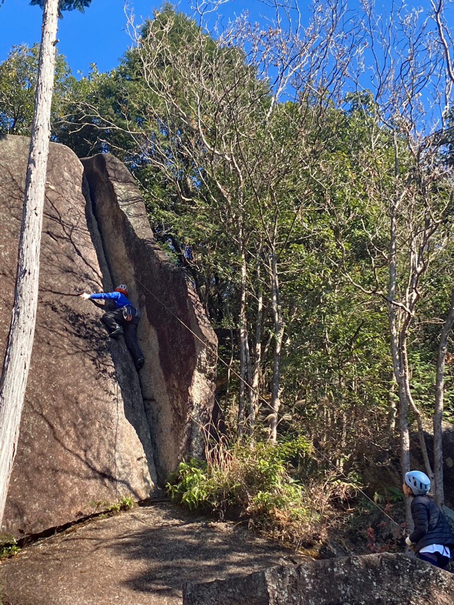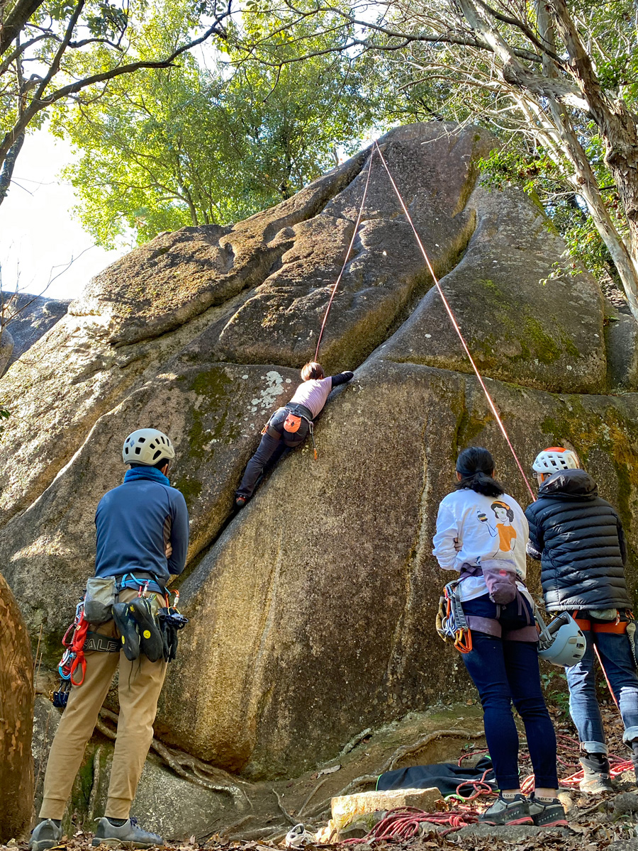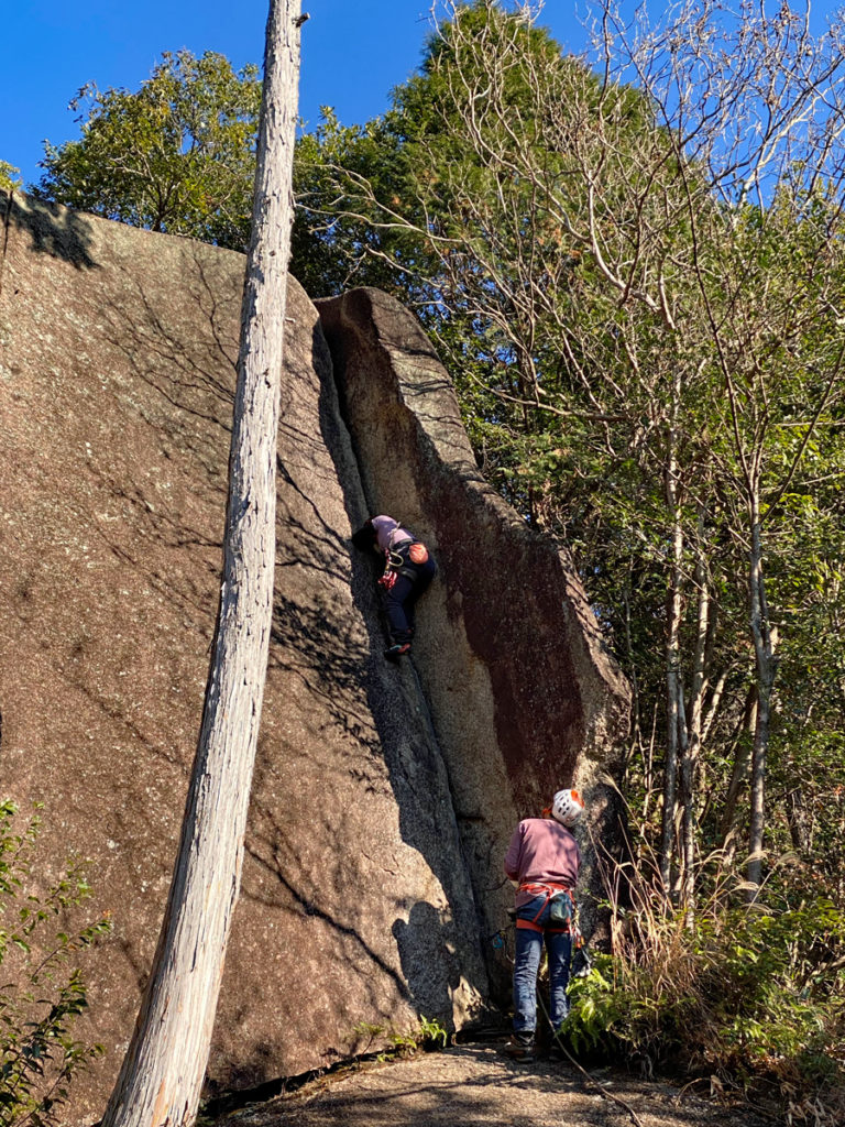 あ〜らよ!の横にあるスラブルートの「たまごスラブ(トポに無くグレード不明)」をTさんがリードで登りTopロープをセット頂き、KさんとWさんが試登。Wさんは初めてのスラブルートをテンションしながら楽しんでいたみたいです〜笑