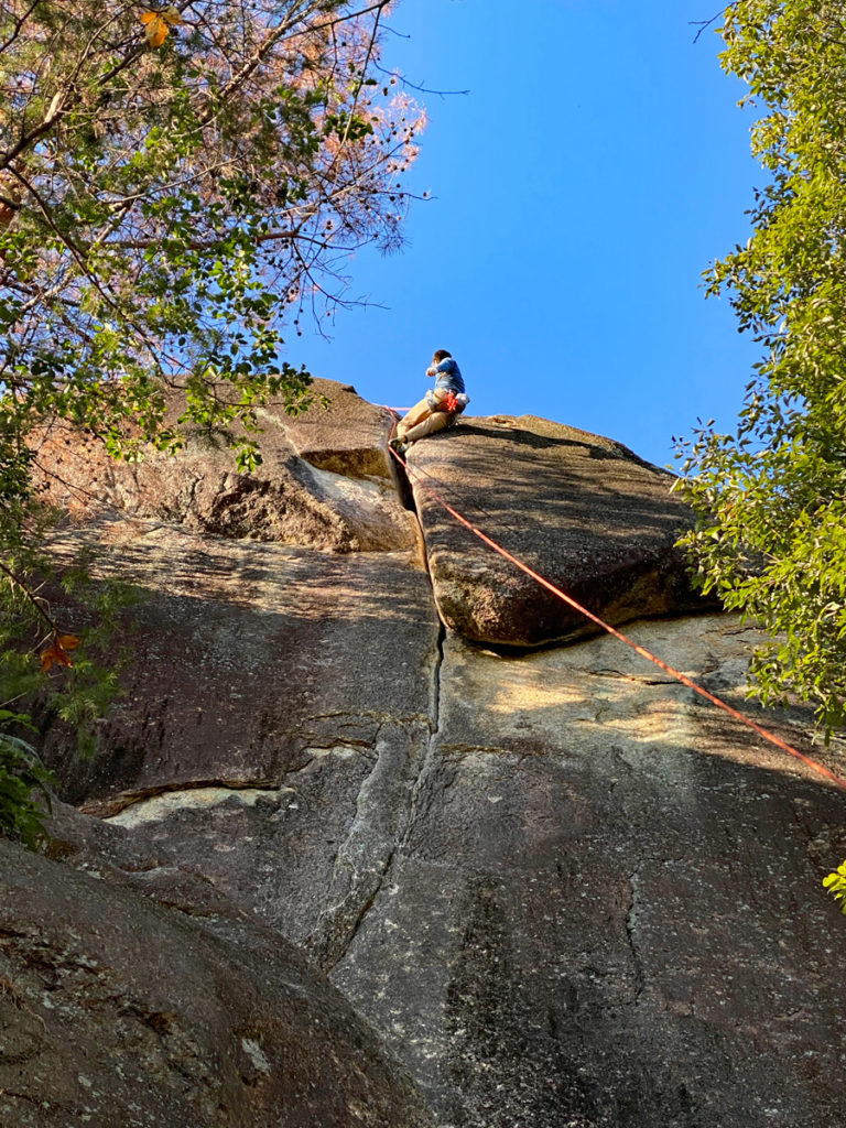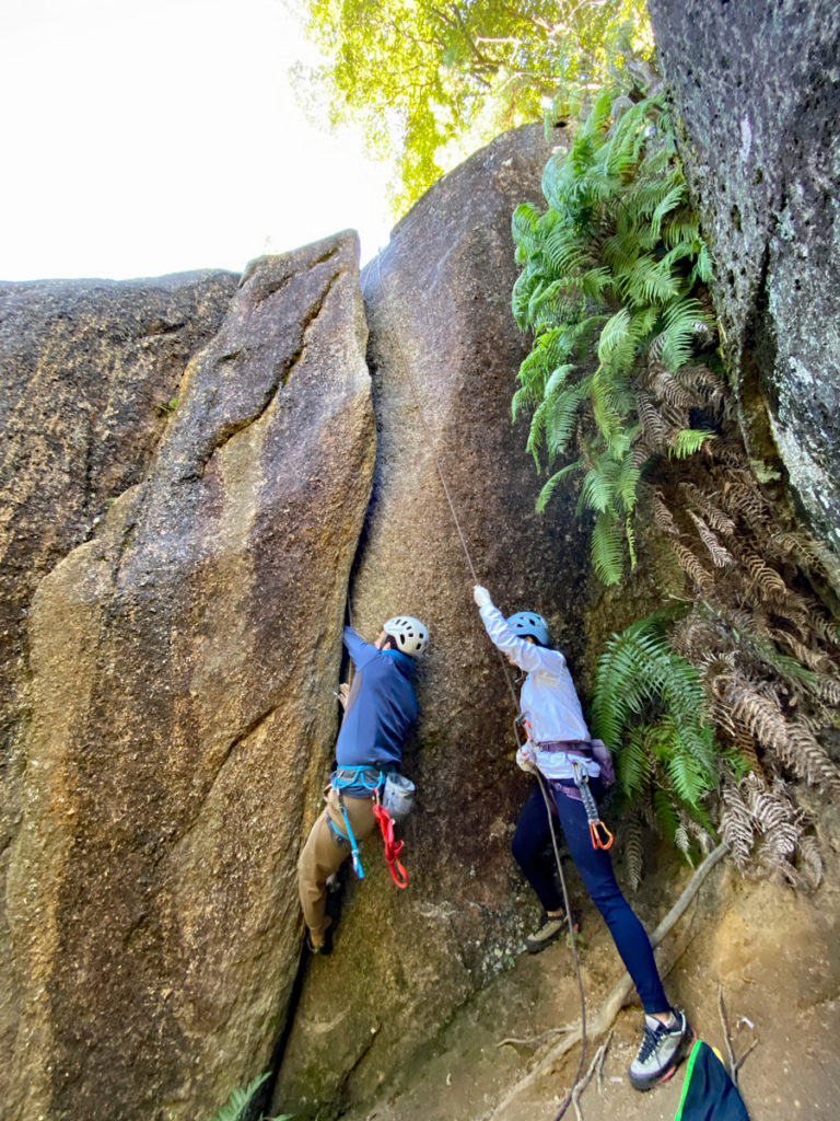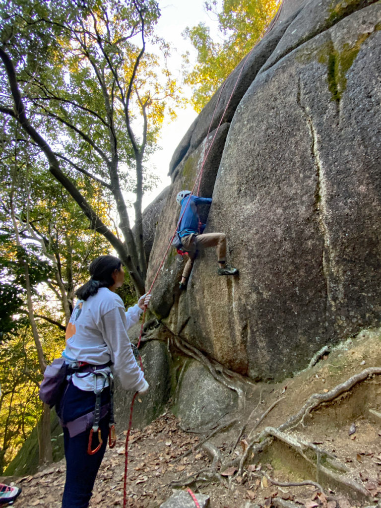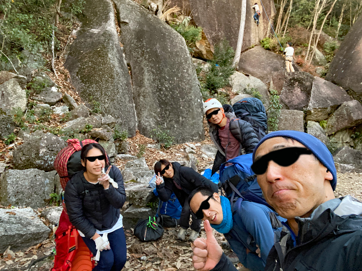最後は、「エースをねらえ(5.10b):シンハンドから上部はワイドクラック」をTさんがリードで登攀。Topロープをセット頂き、各自登攀。これもKさんは当然ながらスイスイと。Wさん、M尾さん、M戸の3人は、何度かテンションしながら、ワイドクラックを堪能してTop Outすることができました。Tさんが、Topロープでおかわり登攀されていたのがすごかった。