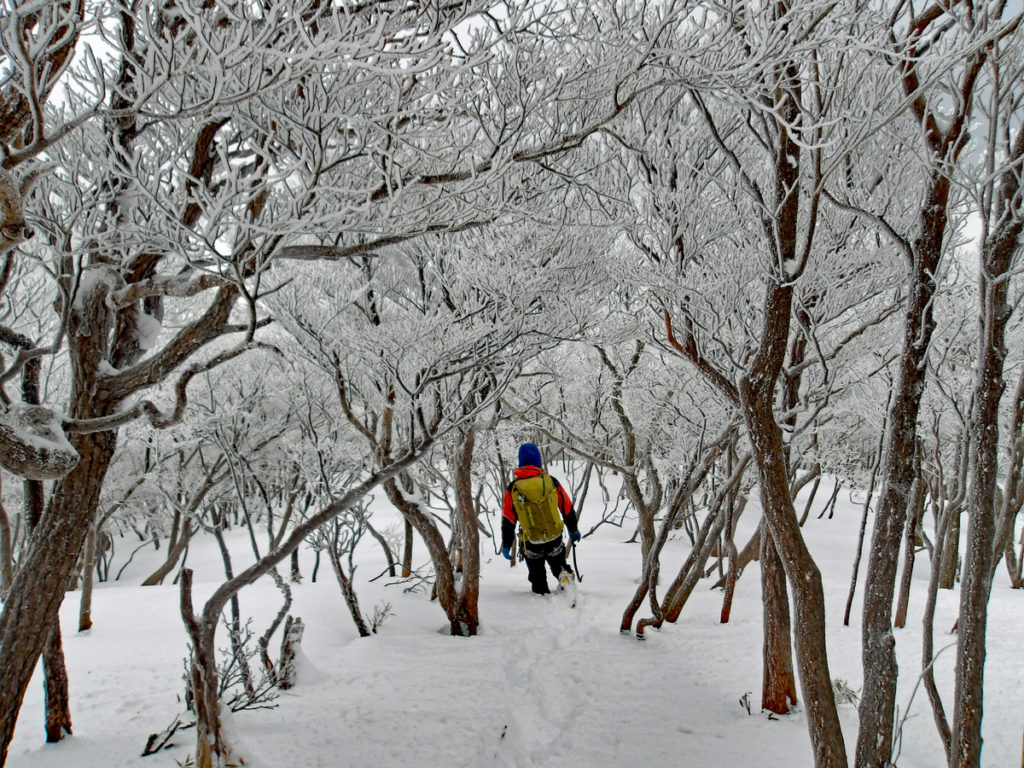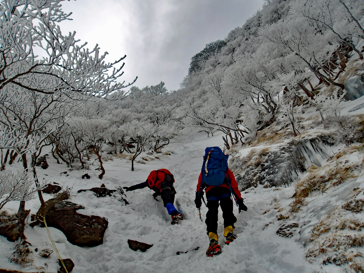 霧氷を観ながら、樹林帯の合間を縫って降りて行く