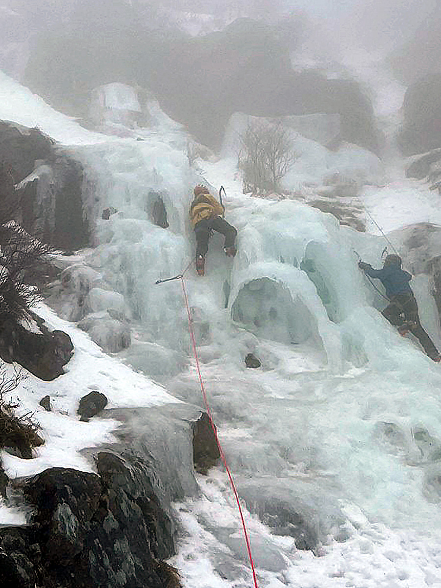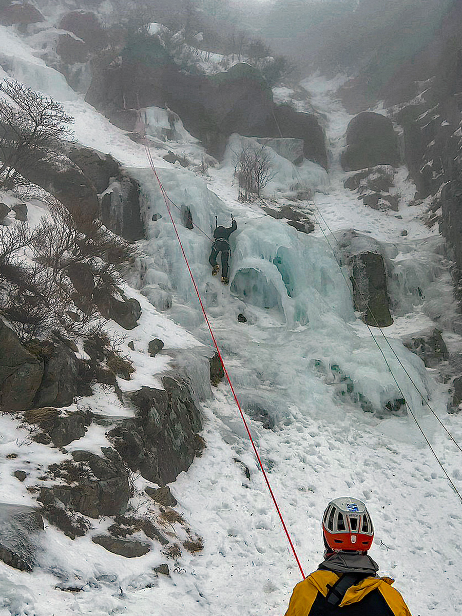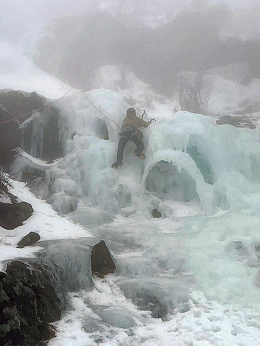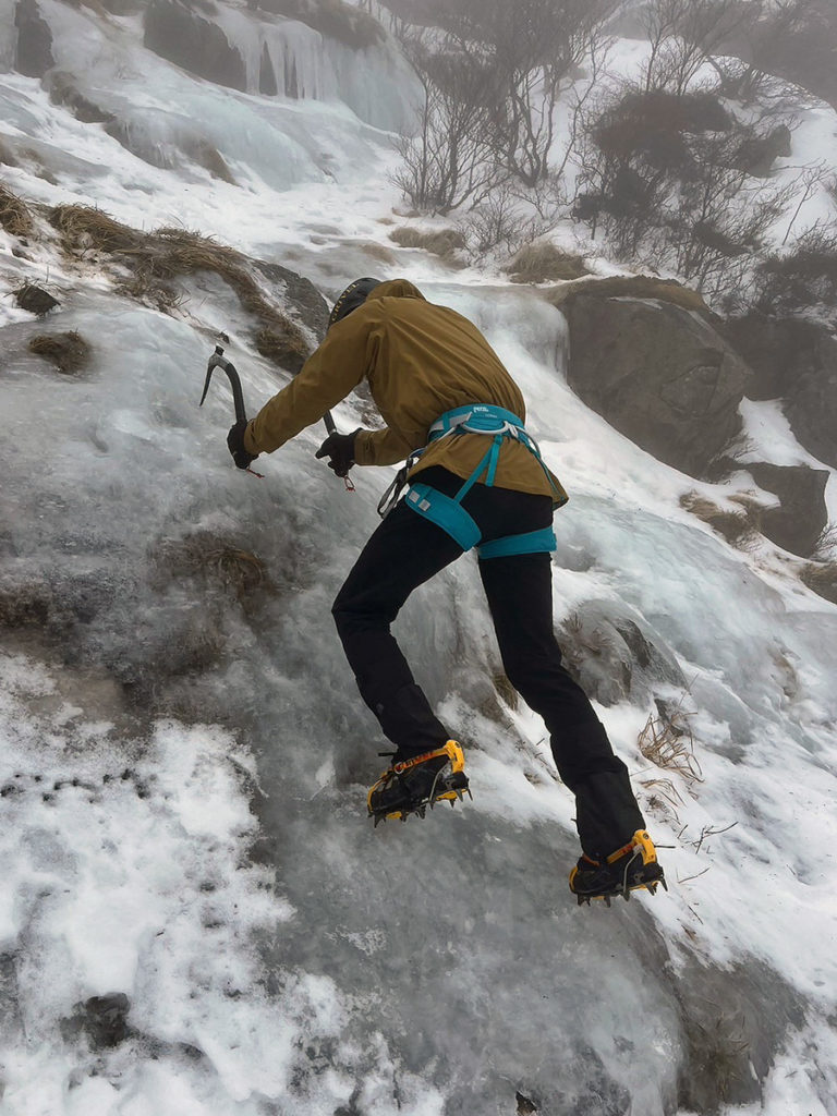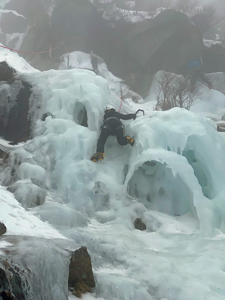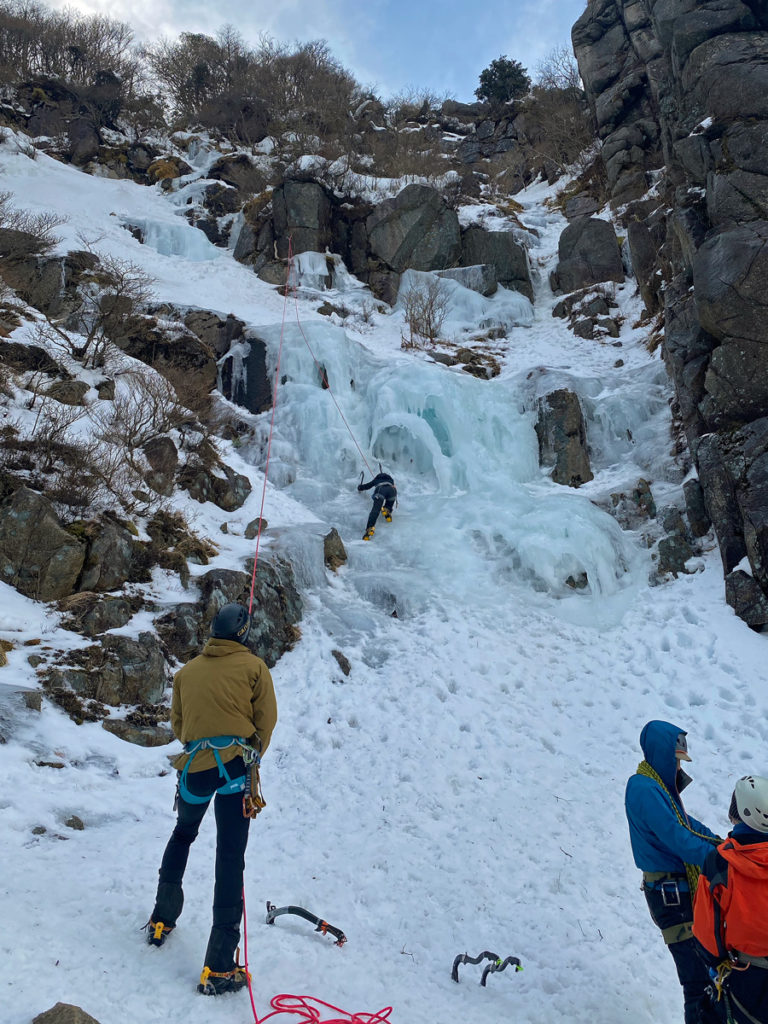 アイスクライミング初心者のN尾さん、O橋さんに、近くの氷が張っているところで練習をしてもらう。登り方をM戸が説明しながら上手く登ってくれる。二人ともボルダリングするので、感が良くさすがですね。アイスアックスとアイゼンを装着して、道具を使って登るアイスクライミングですが、やはりクライミングスキルが問われます。