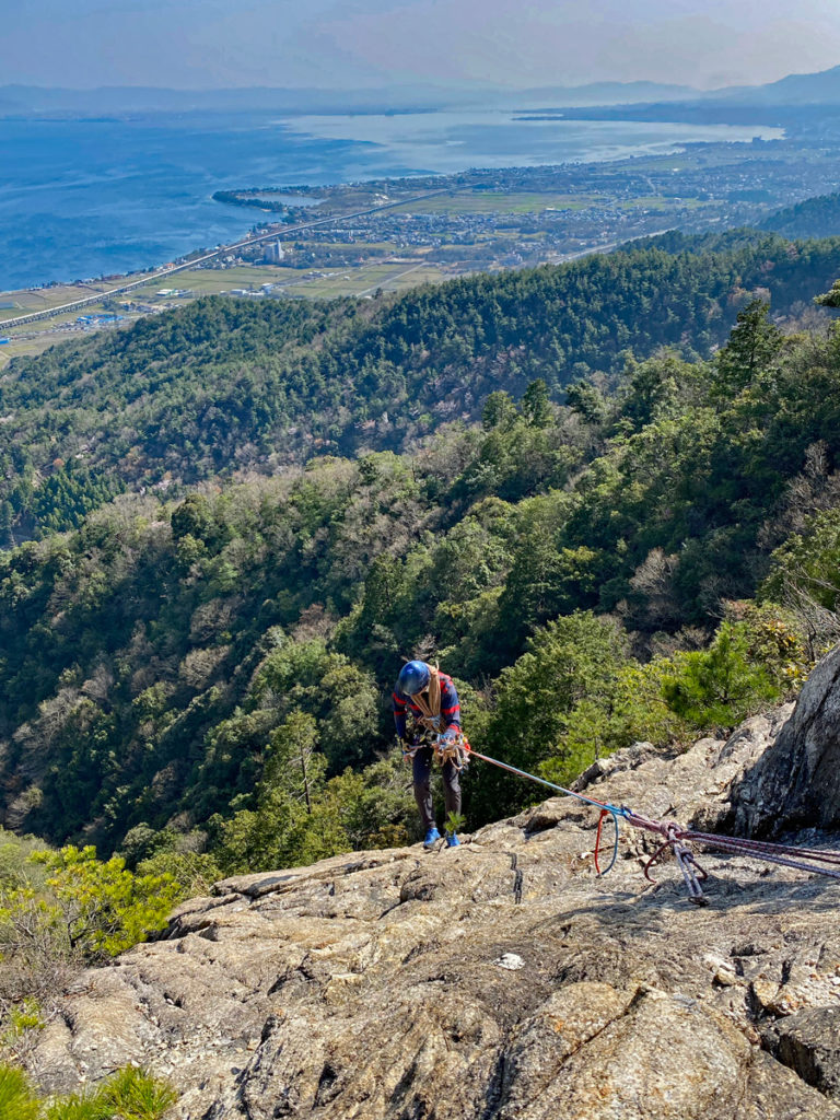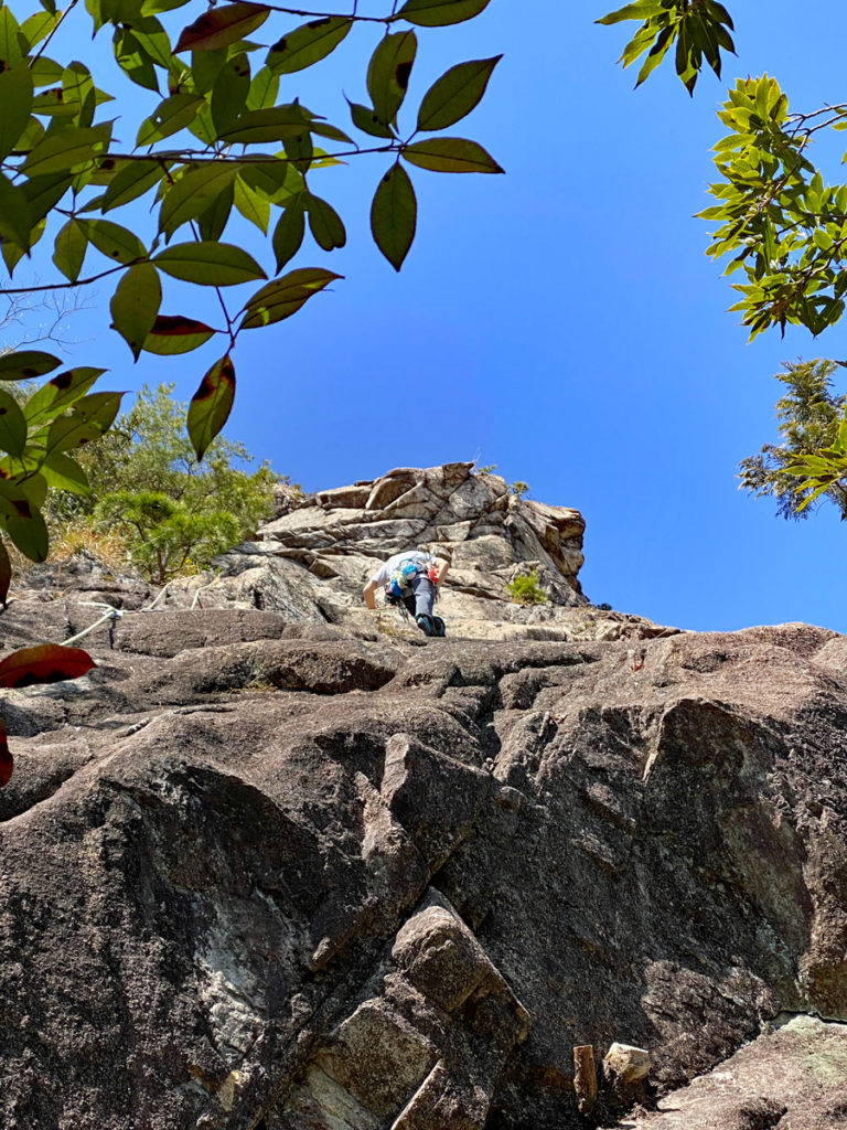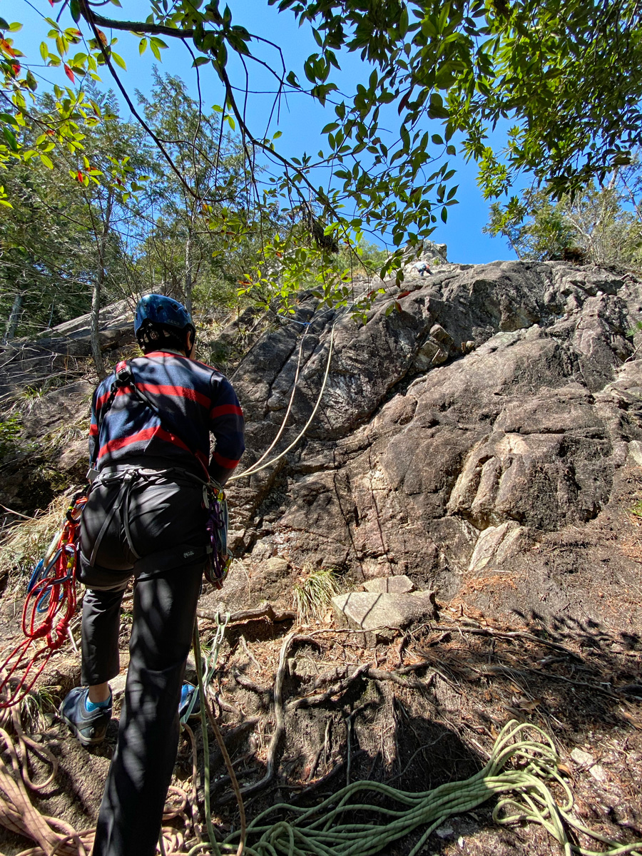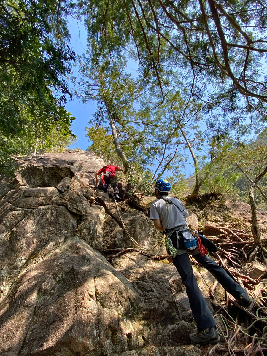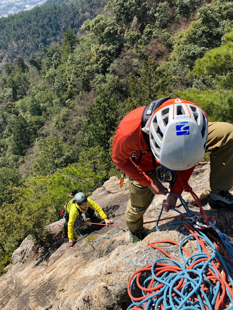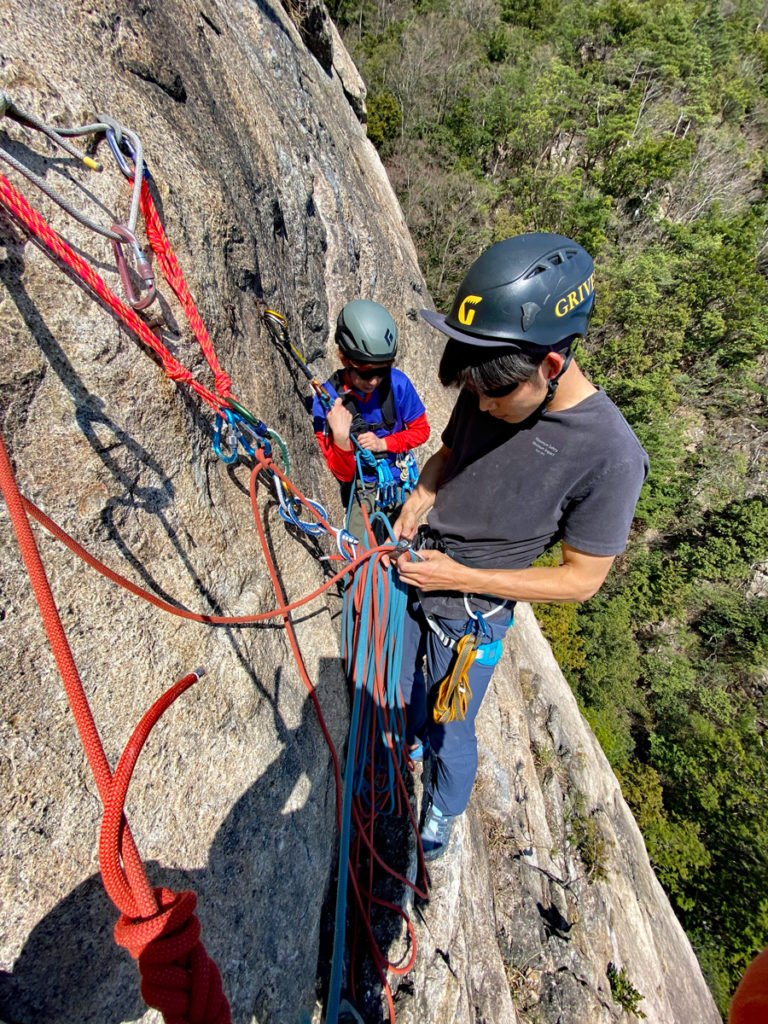 お昼休憩した次は、右ルート2ピッチを登攀です。左ルートと同様にN澤さんとI口さんのベテランがペアとなって、今度はN澤さんがリードでツルベ登攀。その後に、引き続きM戸、S根さん、N尾さんパーティがM戸リードで登攀しました。