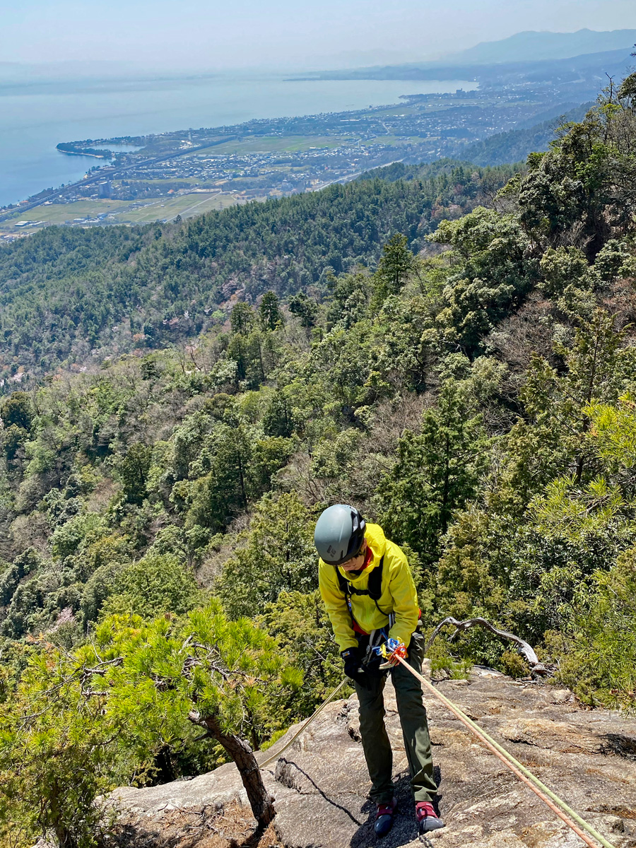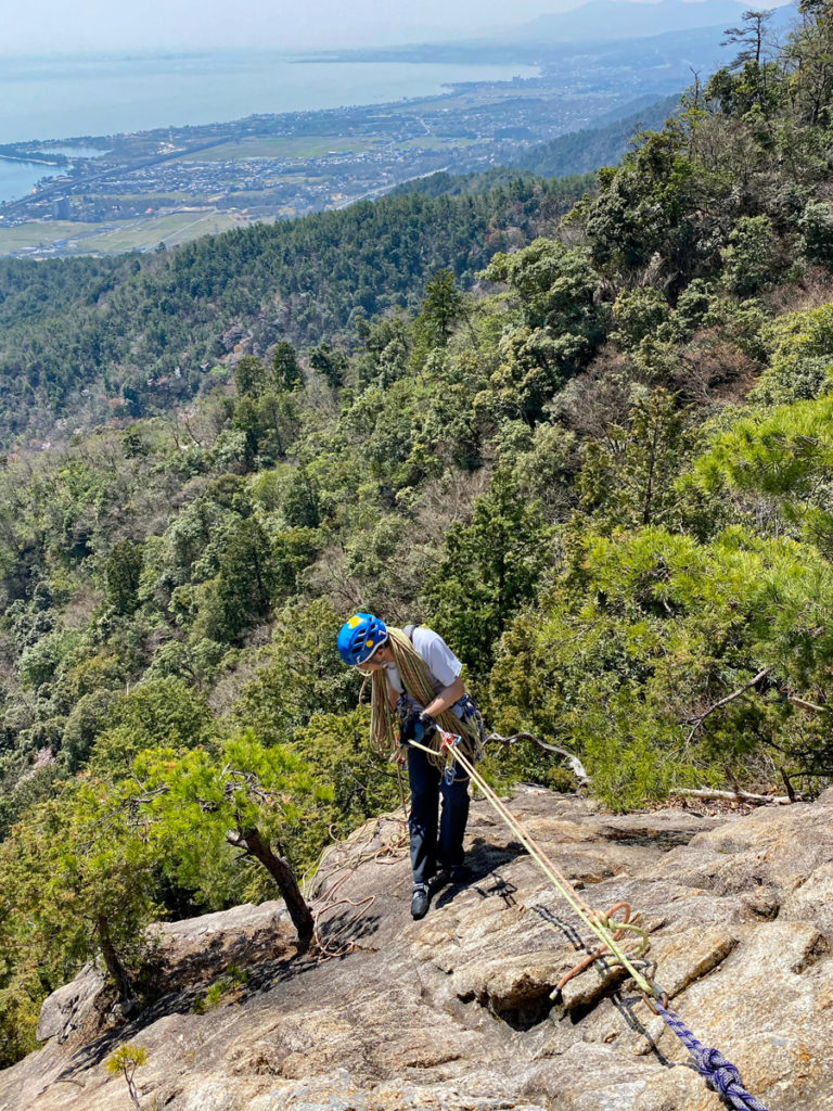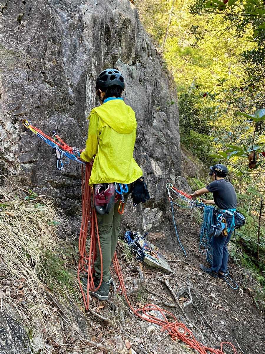 S根さんとN尾さんは、終了点アンカー構築を取り付きのリングボルトで何度も練習してもらいました。N澤さんとI口さんは、左ルートで改めて一連の基礎練習を行い、皆さんみっちり夕方まで練習しました。
