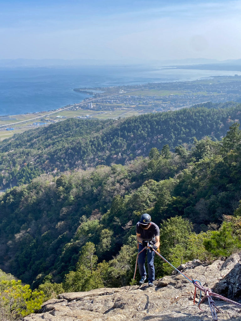 同じくN澤さんとI口さんが先に懸垂下降で降りてもらい、私が再度S根さんとN尾さんにバックアップ懸垂下降の方法を指導し、安全チェックし降りてもらいました。安全に関わることなので繰り返し教えることが大切です。最後はM戸が簡易懸垂でパパッと下降。