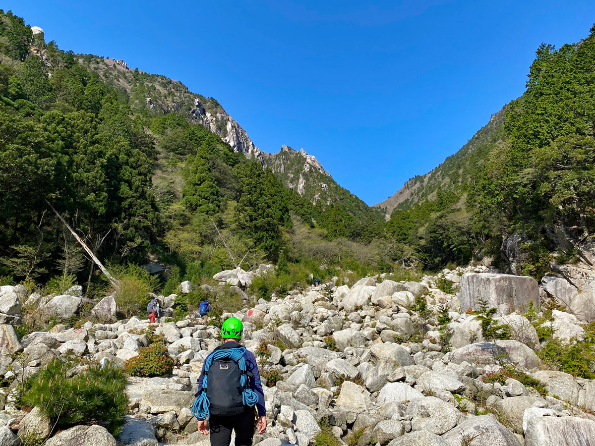 今回は、新人S根さんが本格的なマルチ練習デビューとクライミング春合宿の練習を兼ねて、藤内壁 前尾根を登攀しました。パーティは、M尾さん、S根さんペアと、K林先生、M戸の組合せ。P7取り付きでは、先行にルートに慣れた2パーティが取り付いていて、比較的待ち時間は少なく、早目にスタートできました。