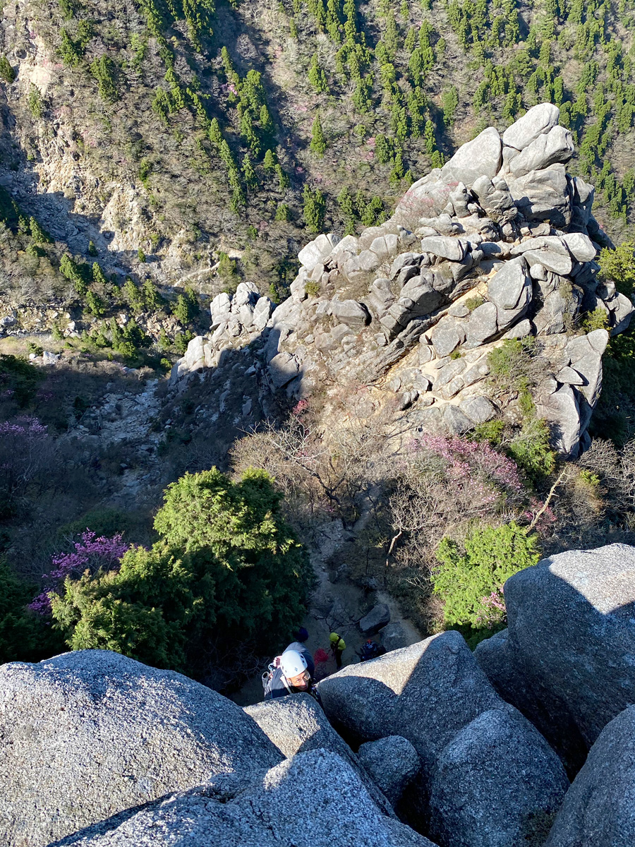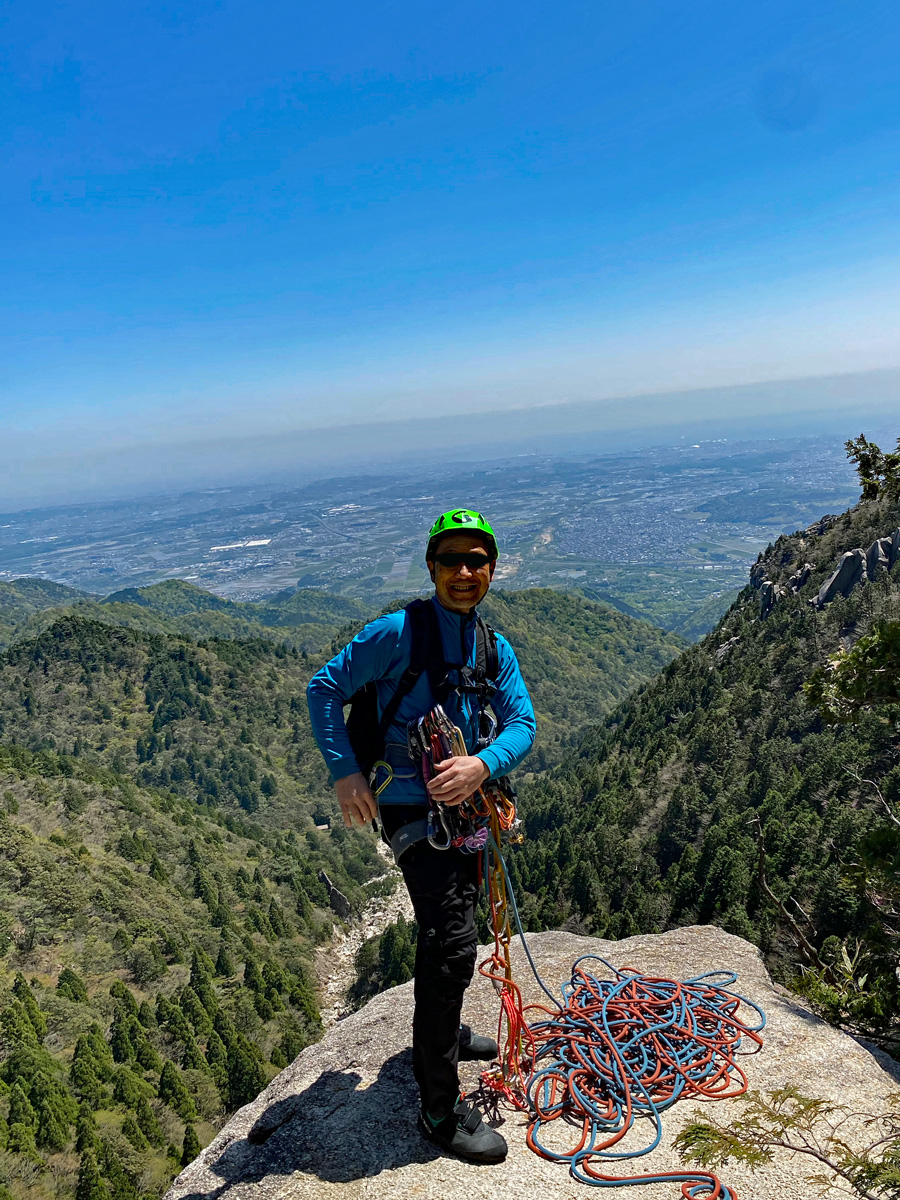 震えながら登攀し、他パーティと交差しながらでも、なんとか14時過ぎにはP3の登攀終了となりました。P2やぐらを登って懸垂下降で降りて一通りの練習は完了です。