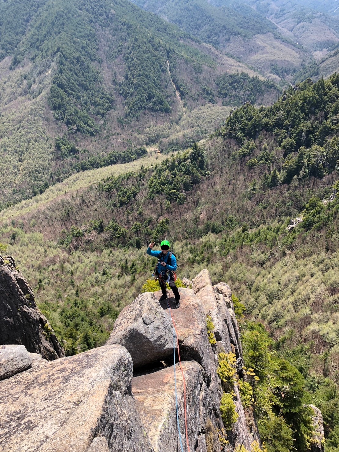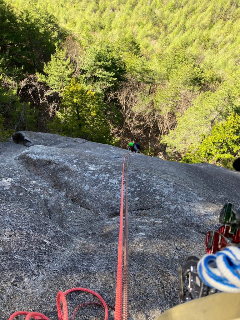 フィナーレとなる絶景を見ながらのピッチ。スタートから2m程上がったところでルートは左右に分かれる。左は快適なクラックルート(5.8)とトボには書いてあったが、プロテクションに必要な4番カムを渡しそびれてしまい、簡単な右ルート(5.6)へ登攀された。レイバックから途中身体がすっぽり入る傾斜の緩いチムニーとなり、怖くはないがフォローで登っても単にしんどいだけで最後に思いっきり疲れた。ちゃんと装備はリード者へ渡しましょう笑
