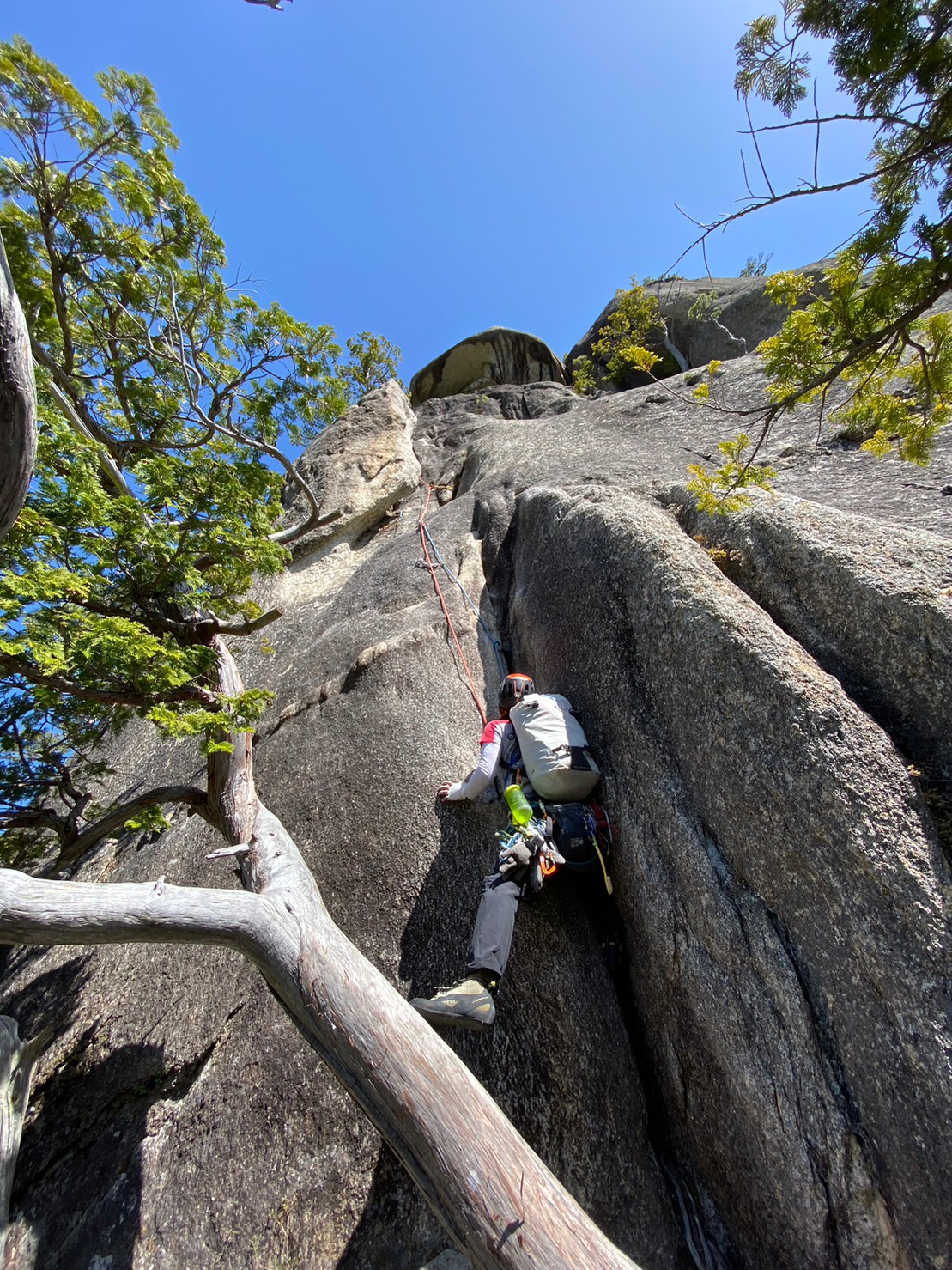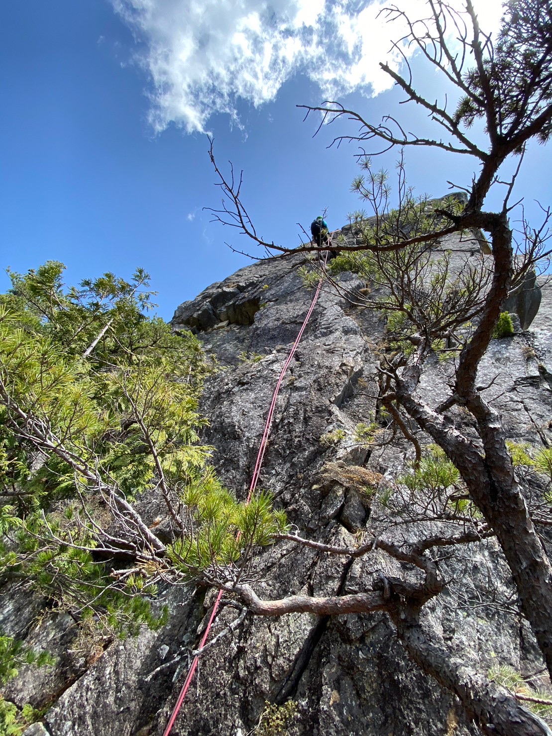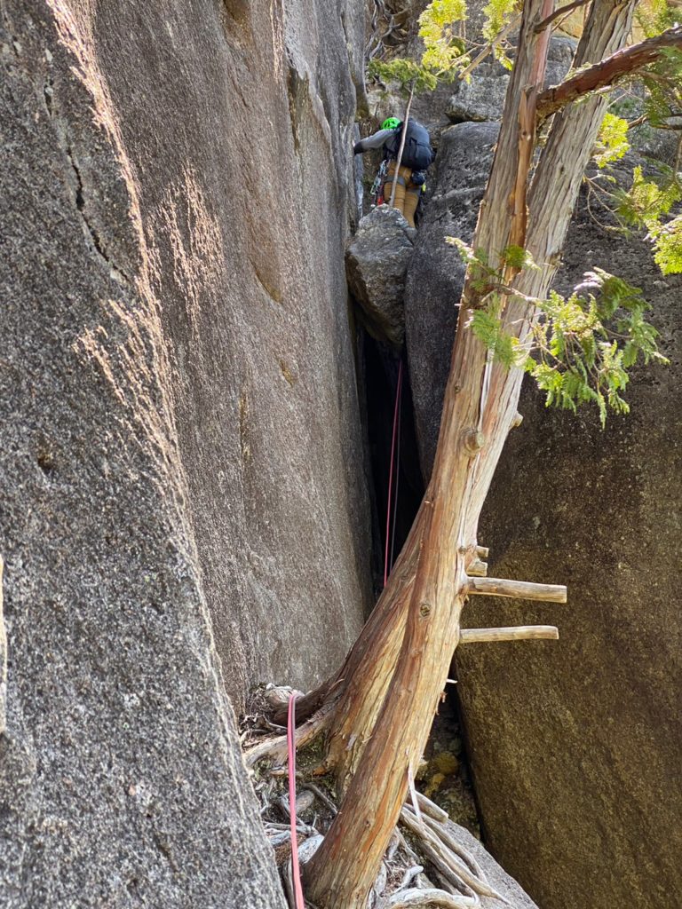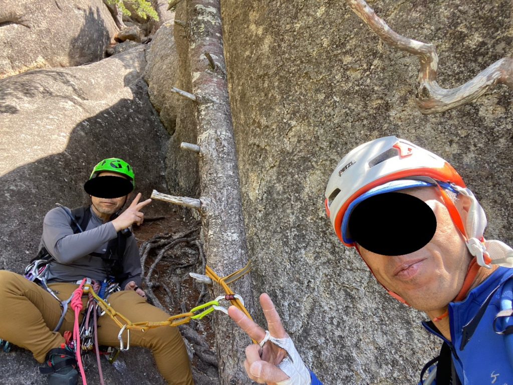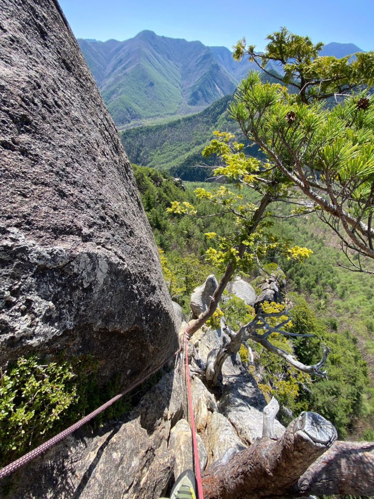 Yの字をした立ち木脇のクラックからスタート。クラック下部で4番のカムを打ちやっぱり持ってきて良かったと思った笑。ハンドジャム、フィストジャムを上手く効かして左のスラブへ移ってマントル返しのチムニー登り。終了点の立ち木に、前パーティがビレイをして取り付けないので、スラブ手前でセルフし、また長待ち。